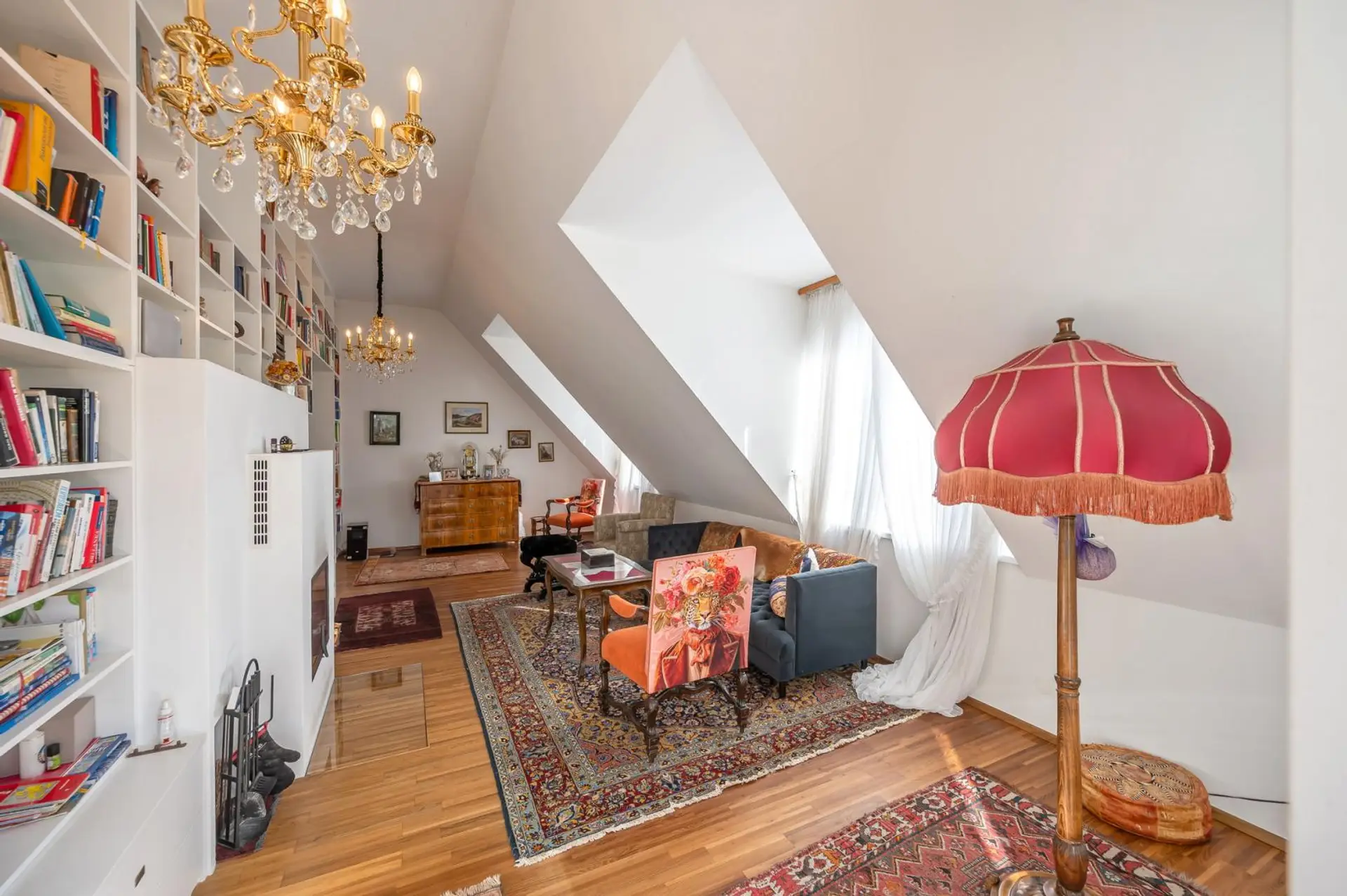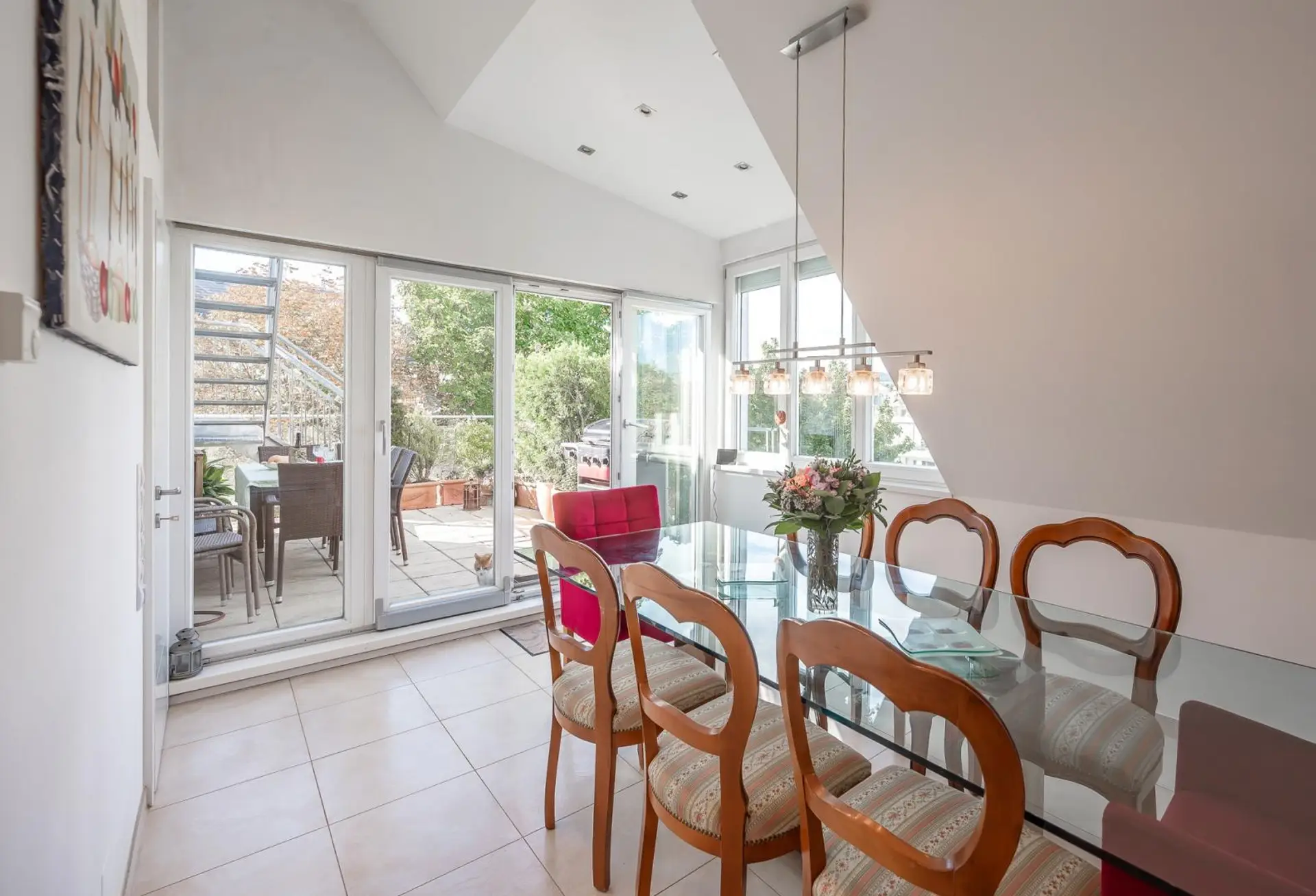 Das Penthouse erstreckt sich über zwei Ebenen eines sehr gepflegten Mehrparteienhauses. Die Raumaufteilung ist durchdacht und großzügig – mit fließenden Übergängen zwischen Wohnen, Arbeiten und Entspannen.