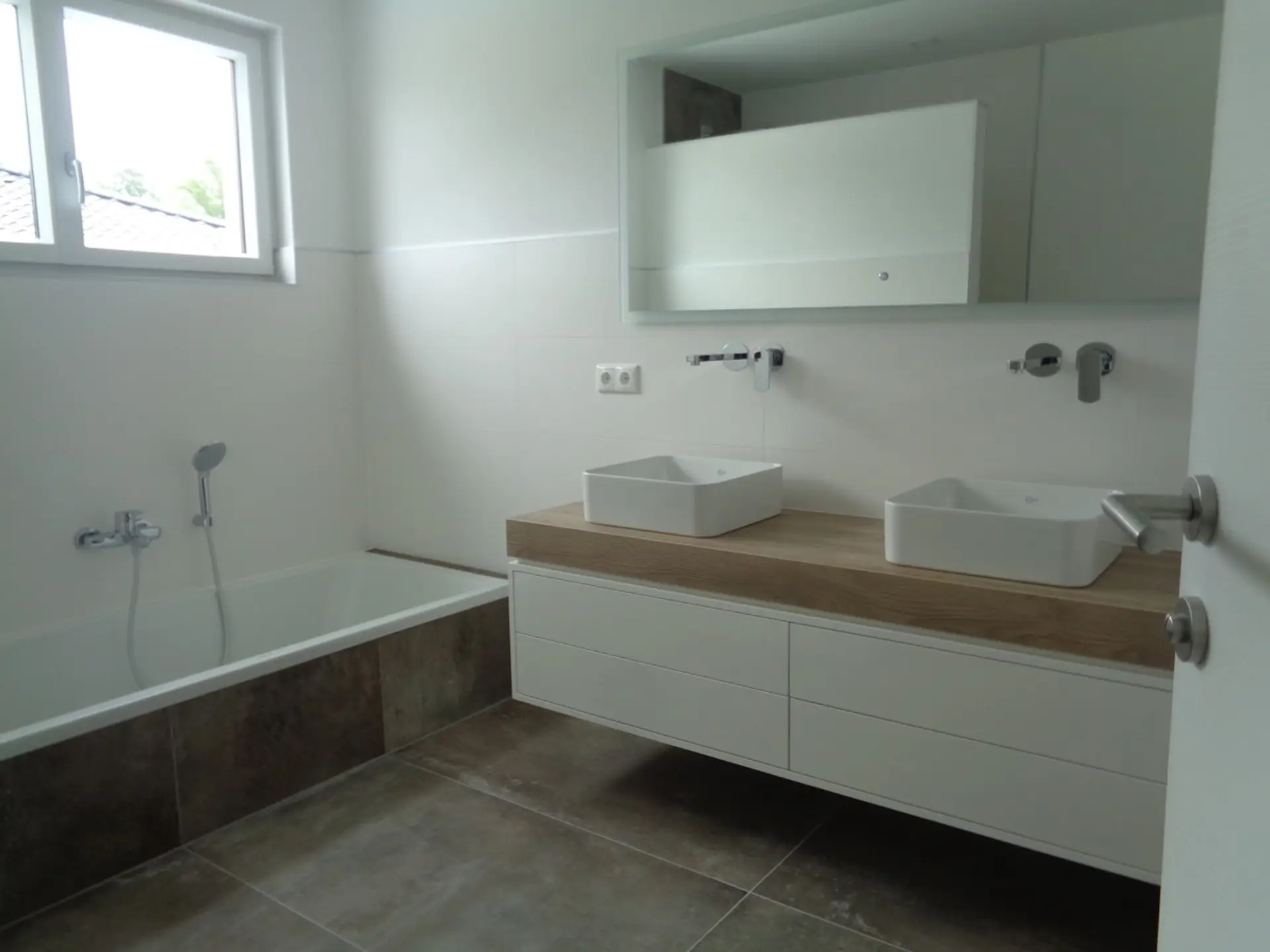Im Vorraum, Badezimmer, WC und im Wirtschaftsraum sind hochwertige Fliesen verlegt. Zwei moderne Waschbecken von Villeroy und Boch und Badmöbel stehen zur Verfügung, genauso wie die Regale im begehbaren Kleiderschrank, die Led – Beleuchtungen, die Garderobe und der Abstellraum für Fahrräder, Kinderwagen, usw.