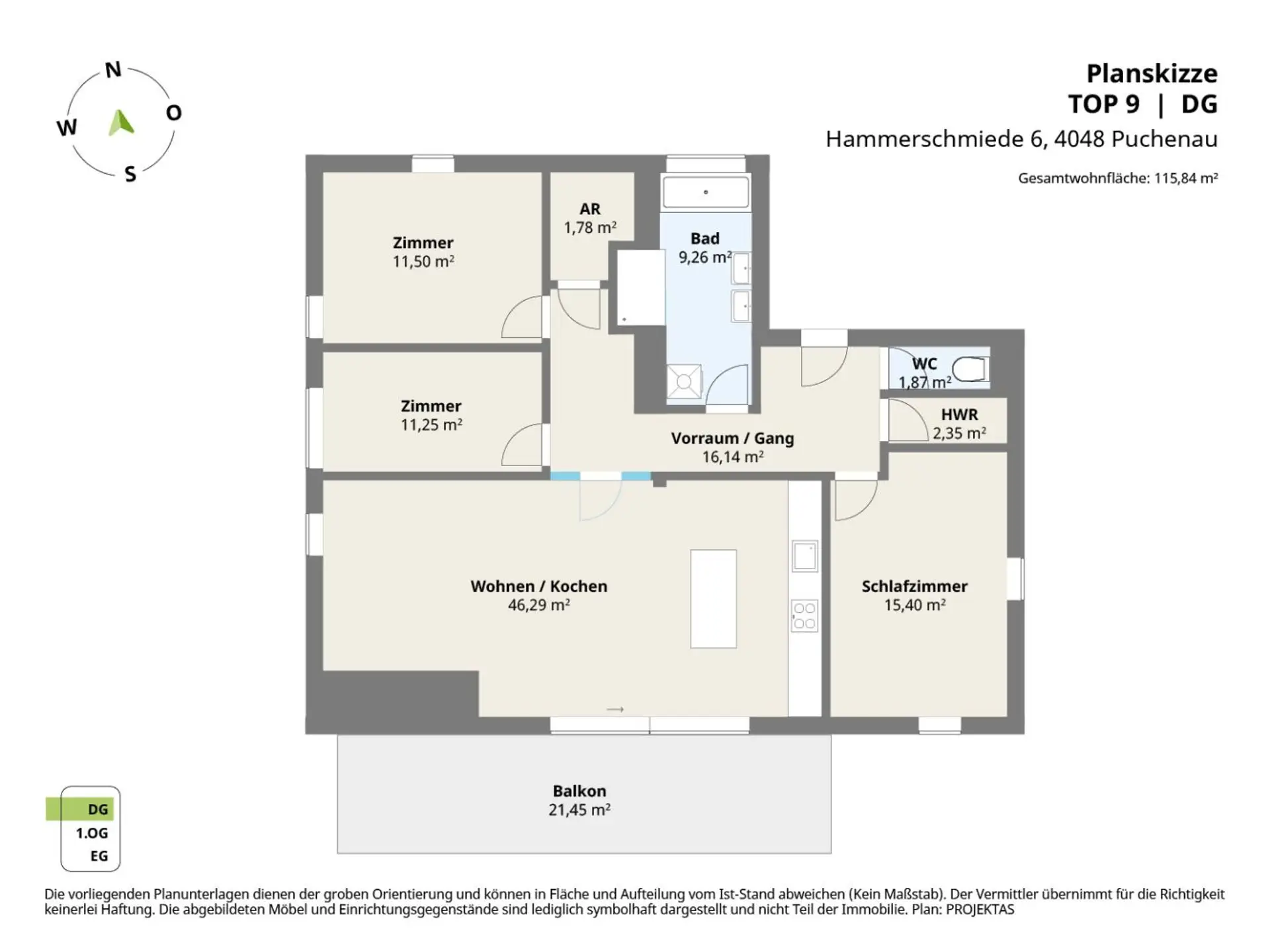 Raumaufteilung der Top 9 mit ca. 115,84 m² Wohnfläche + ca. 21,45 m² Balkon: