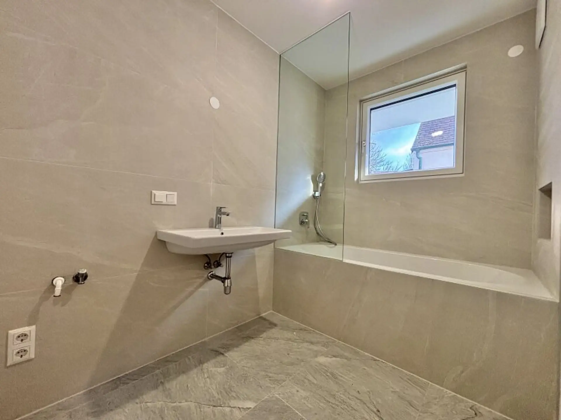 * Hochwertige Innenausstattung (Echtholzparkett in den Wohnräumen und italienische Feinsteinzeugfliesen in den Bädern)