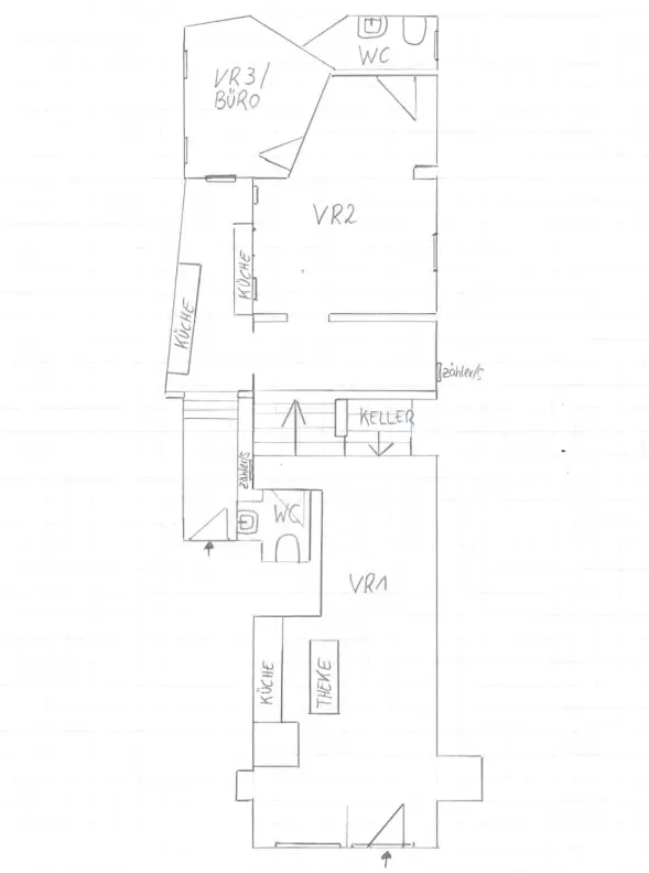Im hinteren Bereich führt Sie eine 6-stufige Treppe hinauf in den zweiten ca. 46 m² großen Verkaufsraum (derzeit geteilt in zwei Räume mit 39 und 7 m²). Nebenbei befindet sich eine Küche, die vollständig in einem mit Glas überdachten Innenhof liegt und über einen eigenen Nebeneingang erschlossen ist.