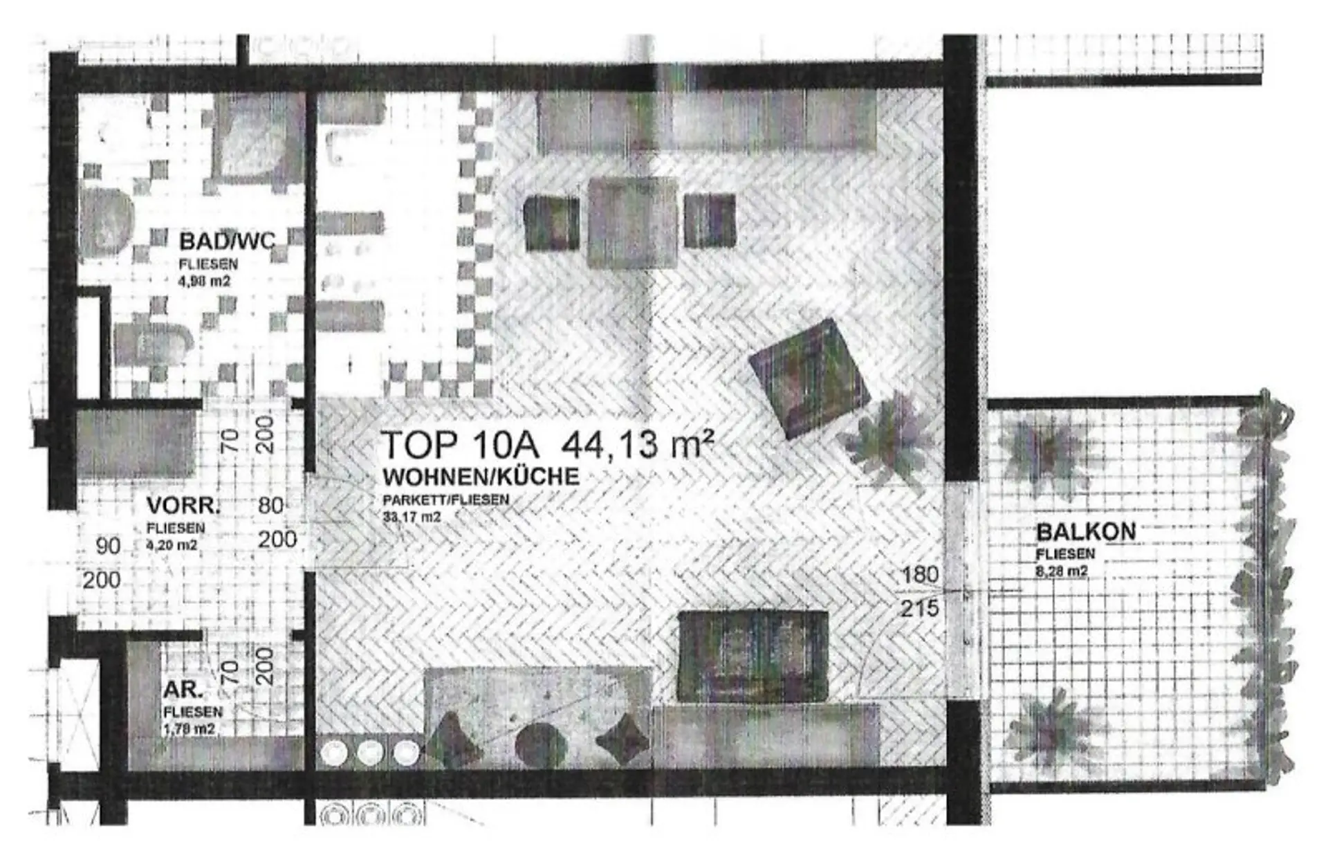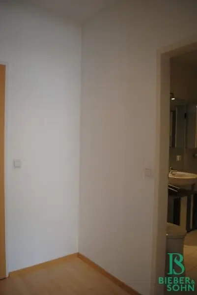Die Wohnung ist übersichtlich und großzügig aufgeteilt; ein kleiner Vorraum, ein großes Bad mit Dusche, WC und Waschmaschinenanschluss, ein Abstellraum und der große Wohnbereich mit einer Küchenzeile und dem sehr großen Balkon.
