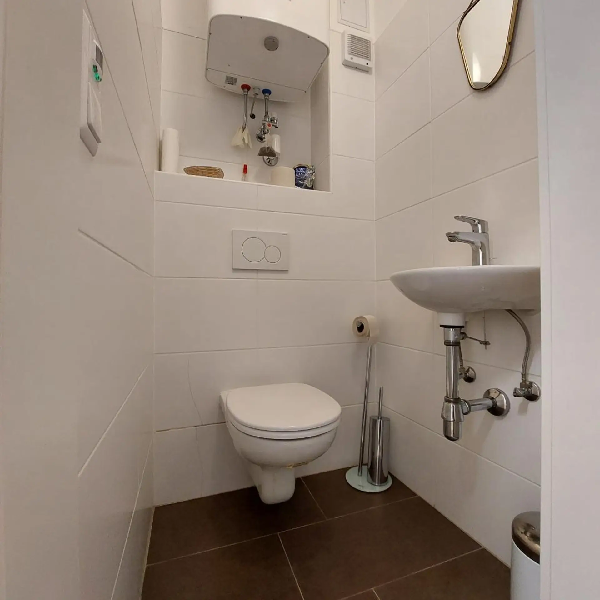 Ein gepflegter Vorraum bietet ausreichend Platz für Garderobe und Stauraum. Rechterhand befindet sich eine separate Toilette. Gleich daneben kommt man in die Küche; ausgestattet mit allen nötigen Anschlüssen, von der aus frische Luft auf dem kleinen Innenhofbalkon geschöpft werden kann. Von der Küche aus gelangt man auch in das kleine Badezimmer mit Dusche, das stilvoll und funktional zugleich gestaltet wurde.