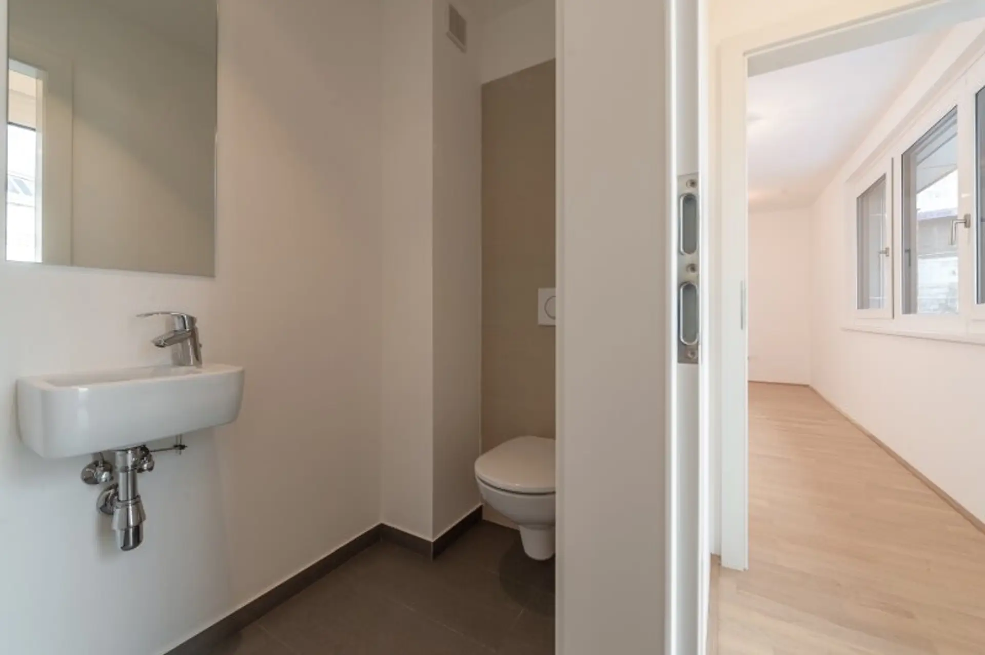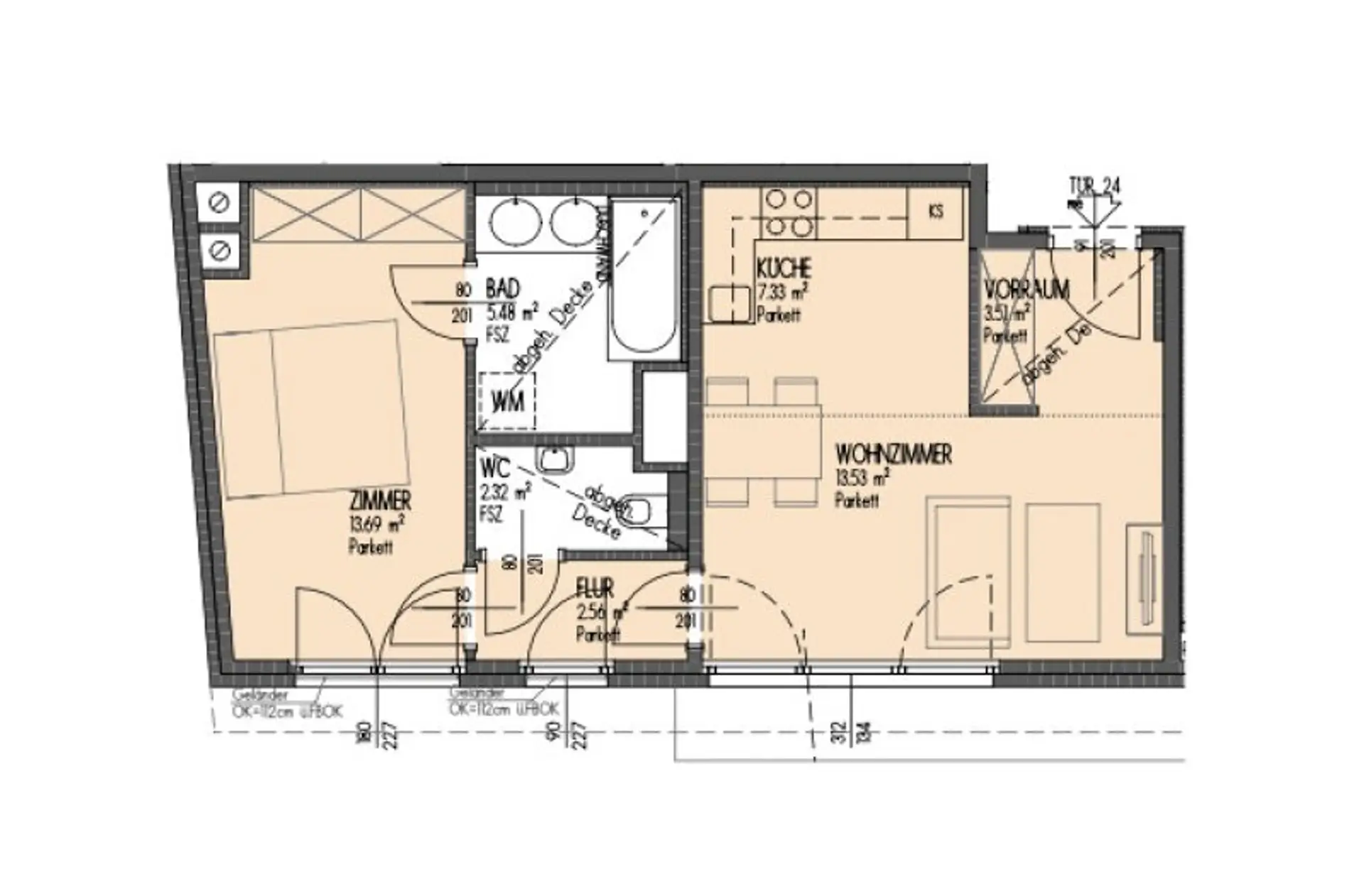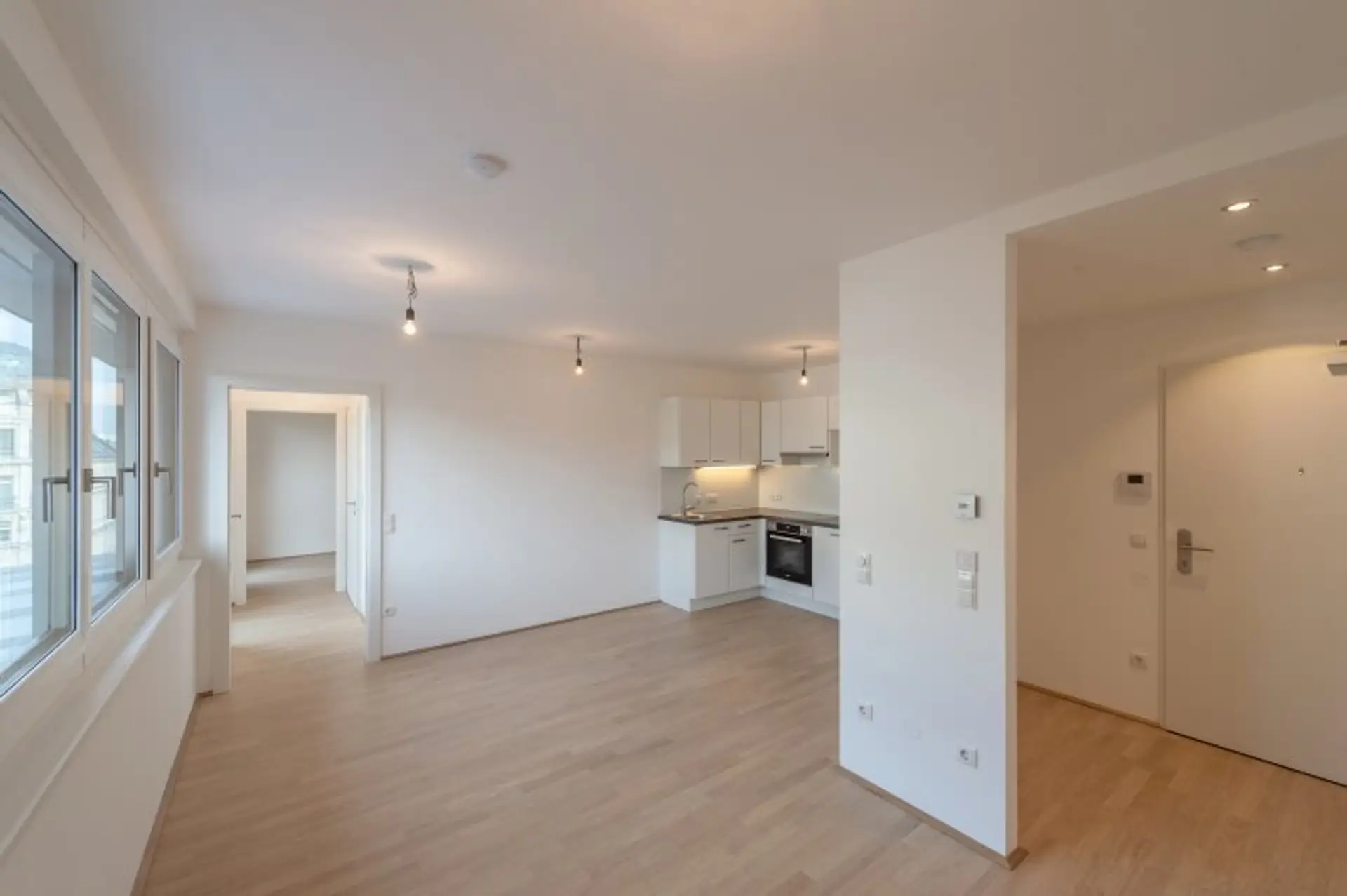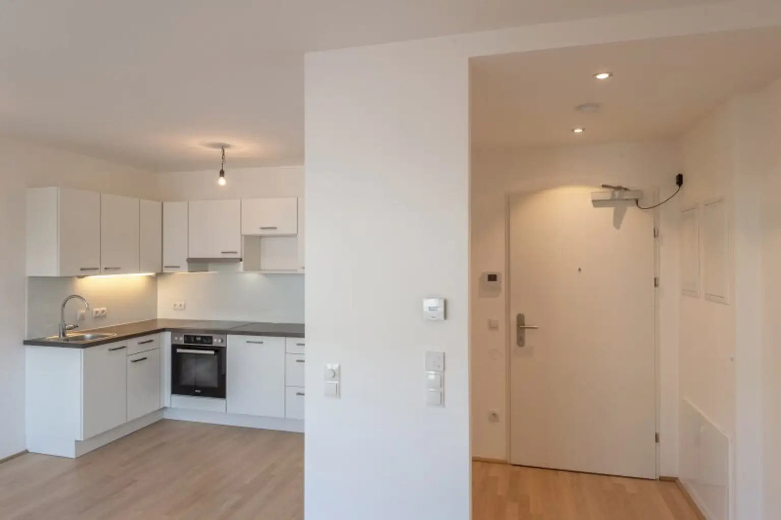 Top 24: Diese wunderschöne ca. 48m² große Neubauwohnung gliedert sich in einen Wohnbereich mit Einbauküche, einen Vorraum, ein getrenntes WC und ein großzügiges Schlafzimmer mit en suite Badezimmer.