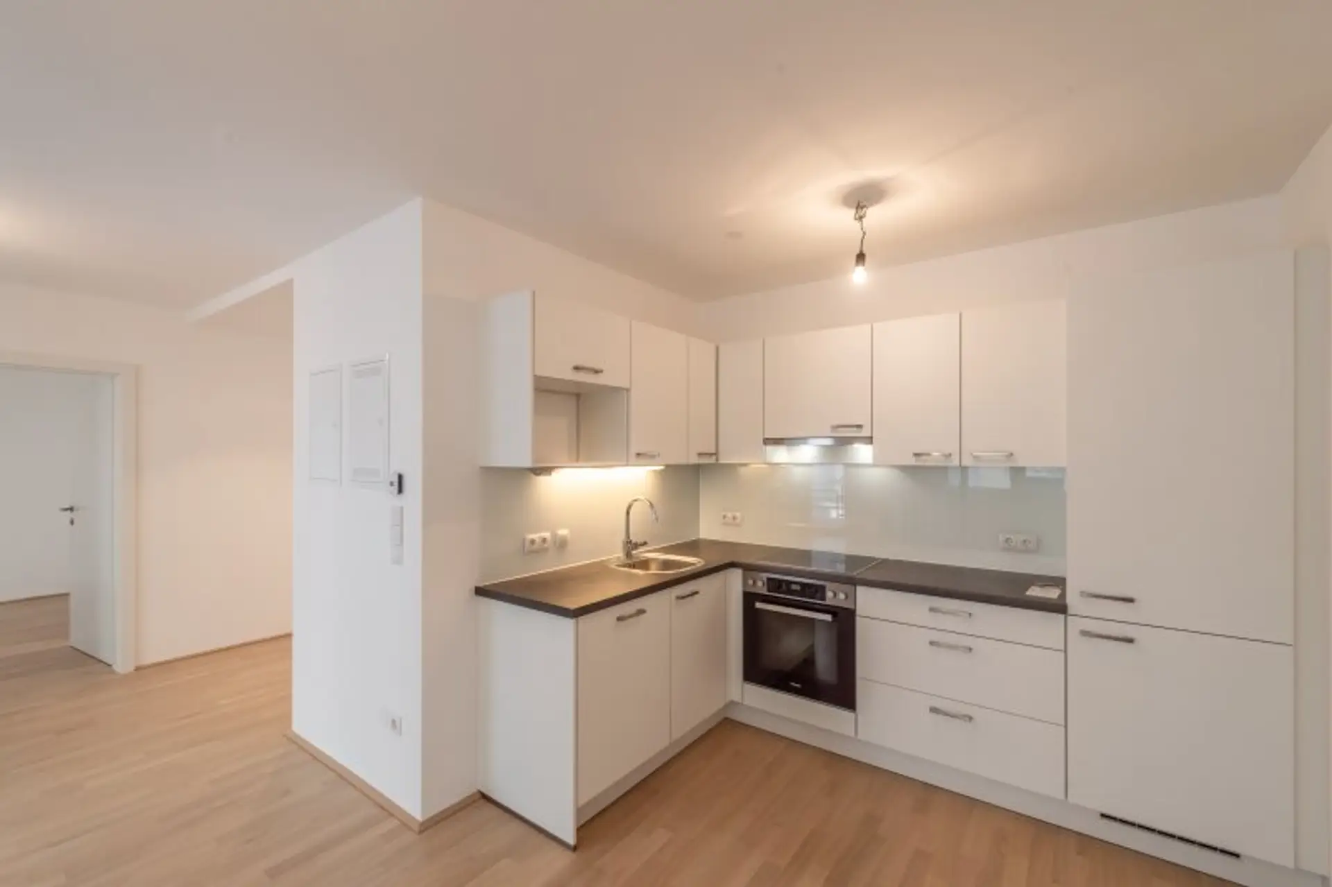 Top 8: Diese wunderschöne 50m² große Neubauwohnung gliedert sich in einen Wohnbereich mit Einbauküche mit Ausgang auf die Loggia, ein großzügiges Schlafzimmer mit en suite Badezimmer, ein getrenntes WC und einen Vorraum.