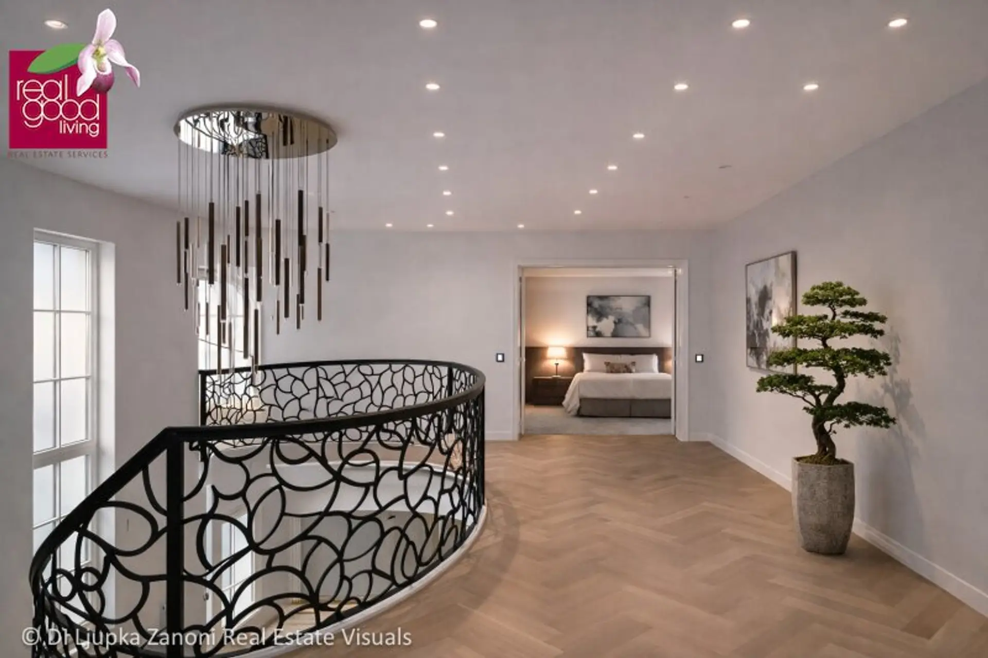 Im Obergeschoss sorgt die Galerie für beeindruckende Blickachsen und architektonische Tiefe. Mehrere Schlafzimmer mit Garderobenräumen sowie großzügige Badezimmer schaffen private Rückzugsorte auf höchstem Niveau.