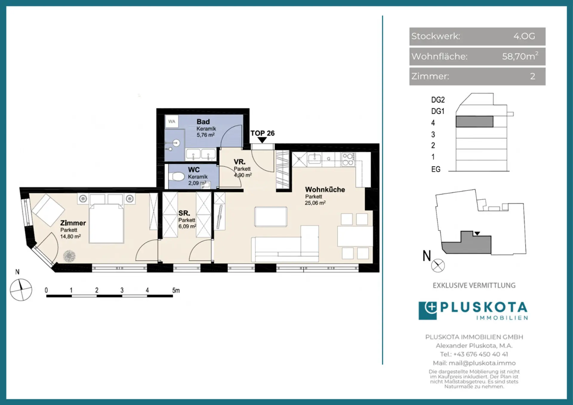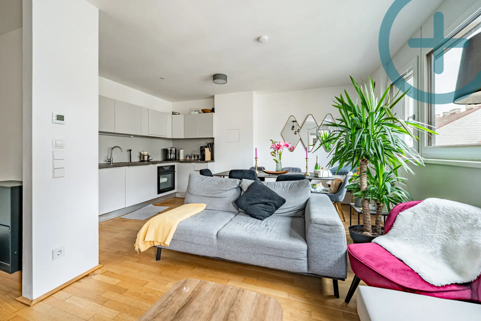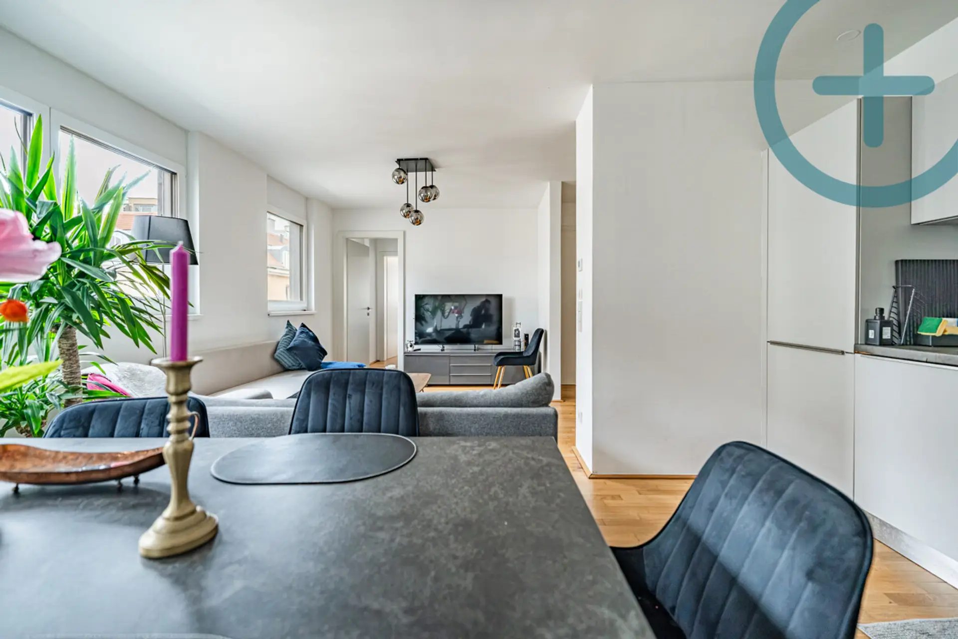 Zum Verkauf gelangt eine stilvolle 2-Zimmerwohnung im 4. OG eines im Jahr 2019 errichteten Neubaus. Auf 58,70m² präsentiert sich die Wohnung sehr offen, einladend und hell. Das Vorzimmer bietet ausreichend Platz für die Garderobe und bietet den Zugang zum Badezimmer, WC und in das offene Wohnzimmer. Der Wohn- und Essbereich mit integrierter Küchenzeile umfasst ca. 25m² und bildet den zentralen Mittelpunkt der Wohnung. Große Fensterflächen sorgen für ein freundliches, lichtdurchflutetes Ambiente. Über den 6m² Schrankraum gelangt man in das ca. 15m² große Schlafzimmer mit Platz für Doppelbett und Schreibtisch. Das Badezimmer verfügt über Dusche, doppelten Handwaschbecken und Waschmaschinenanschluss. Das WC inklusive Handwaschbecken ist separat begehbar. Die Wohnung ist aktuell bis September 2027 befristet vermietet. Die Mieteinnahmen belaufen sich auf EUR 727,43 Netto abzgl. der Rep.RL von EUR 13,71.