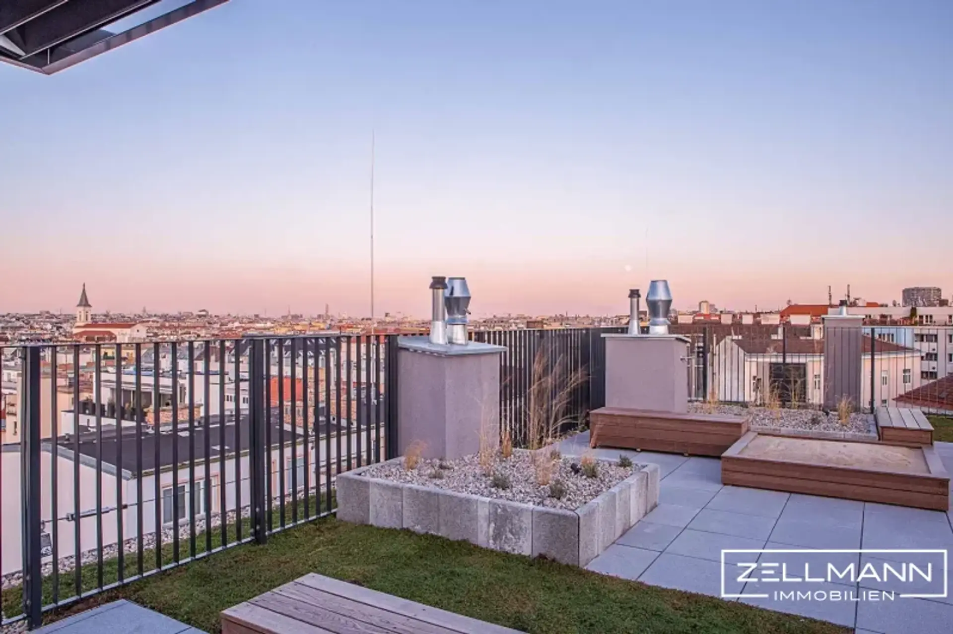Eine gemeinschaftliche Rooftop-Terrasse mit Blick über Wien sowie eine hauseigene Tiefgarage ergänzen das hochwertige Gesamtkonzept.