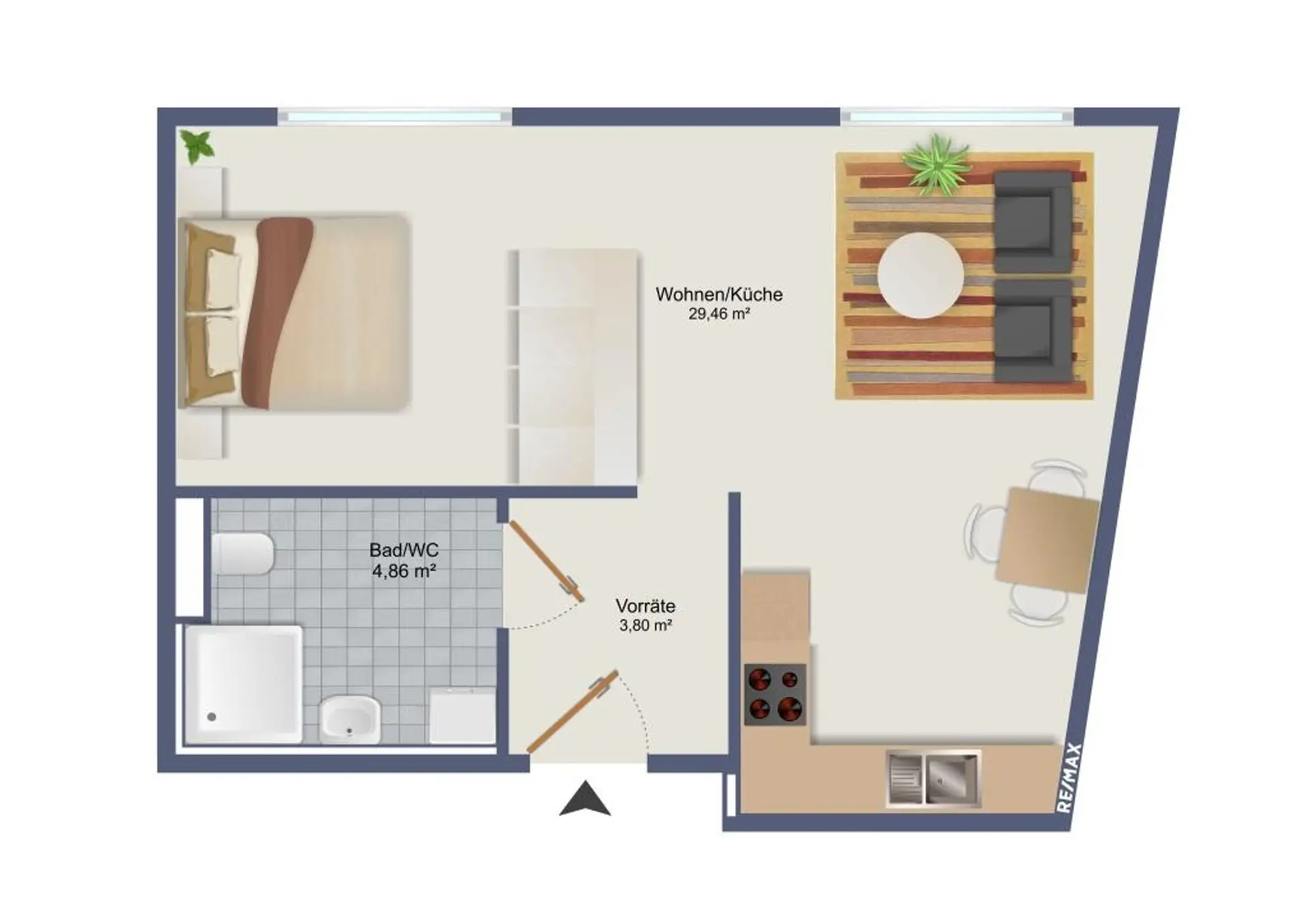 Diese teilt sich auf in einem Vorraum mit genügend Stauraum, einem Bad mit WC und Dusche und einem großzügigen Wohn-/Essbereich mit einer modernen Einbauküche. Das Schlafzimmer ist mit einem maßgeschneiderten Kastenelement vom Wohnzimmer getrennt.