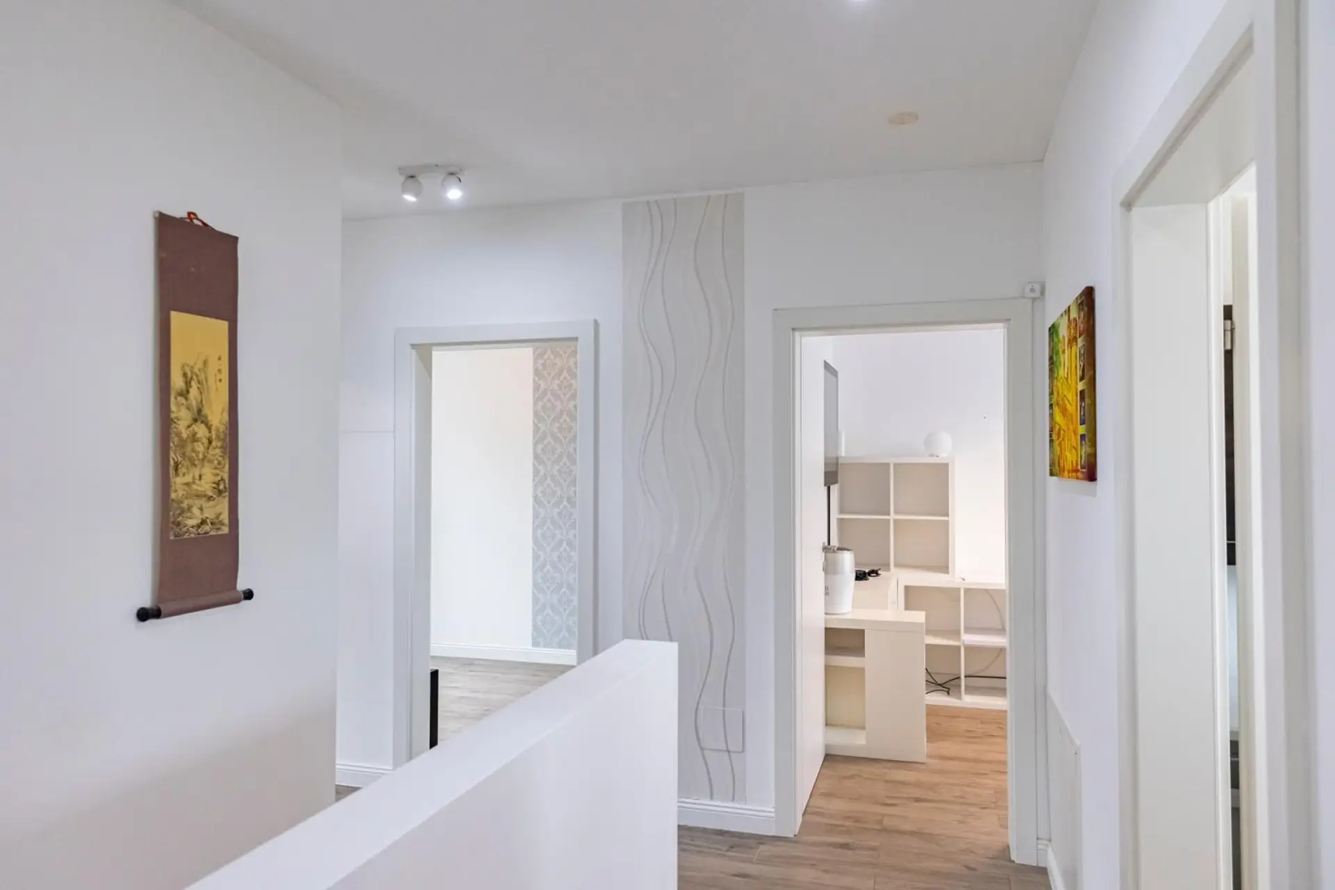 Im gesamten Haus befindet sich eine Fußbodenheizung und Fliesen in Holzoptik.