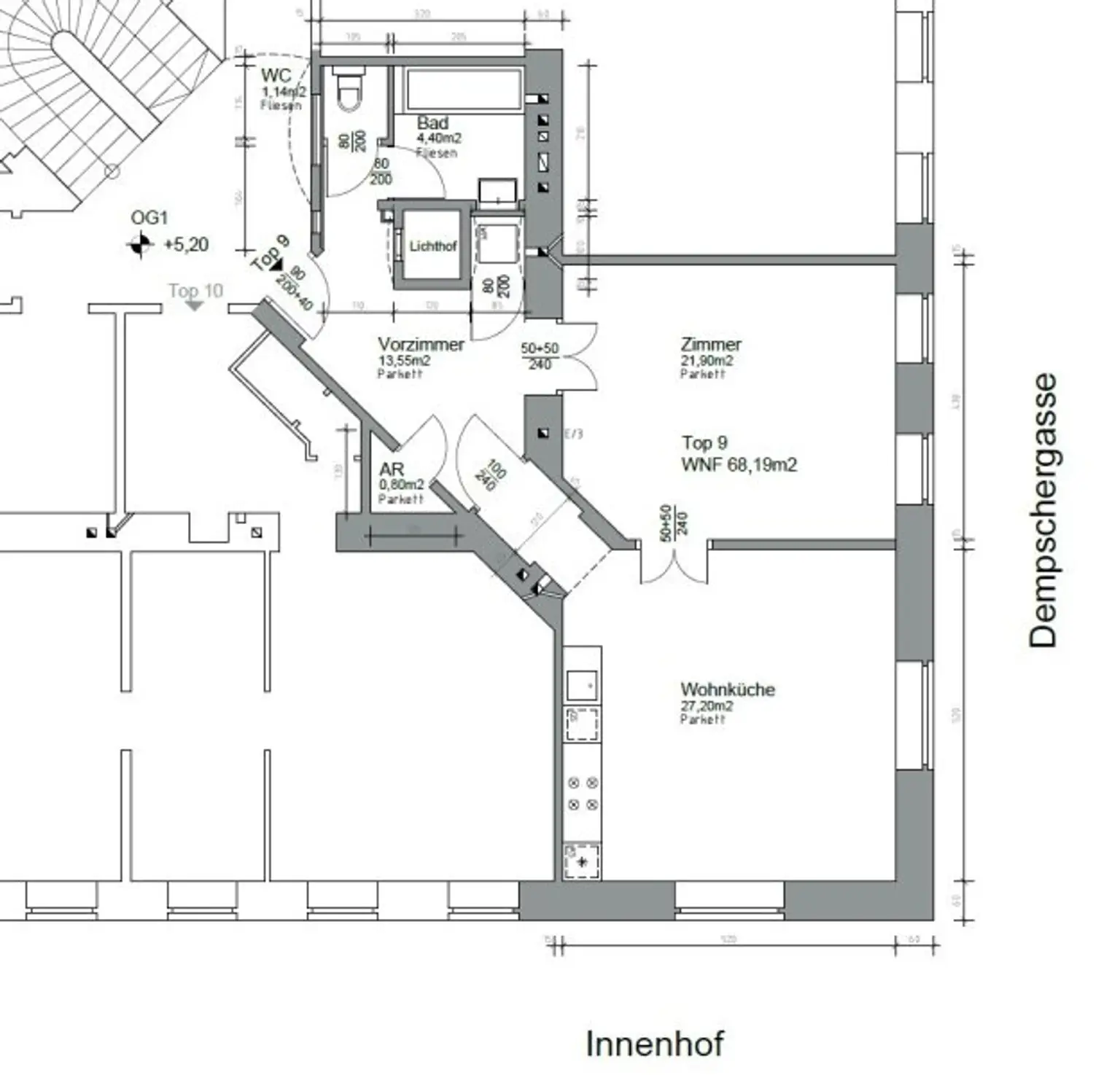 Die insgesamt ca. 69,27m² Wohnfläche im hellen 1.Stock (mit Hochparterre) teilen sich wie folgt auf: