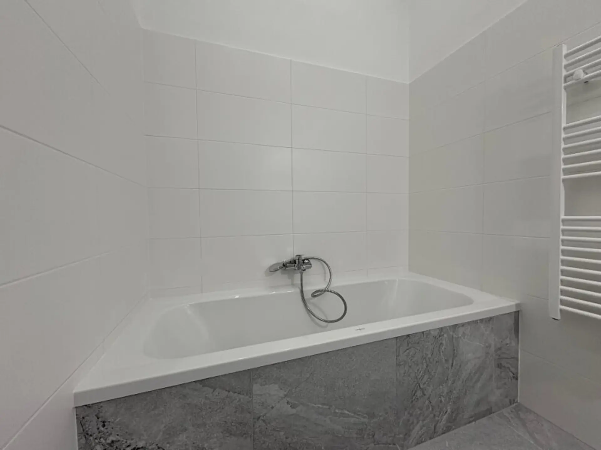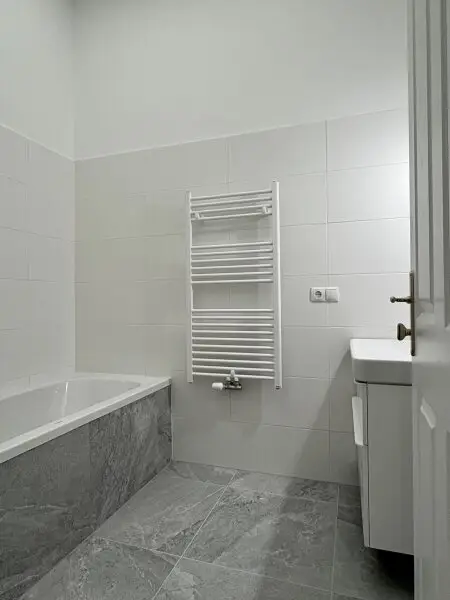 * neues Badezimmer mit Badewanne, hochwertigem Waschtisch und Handtuchtrockner