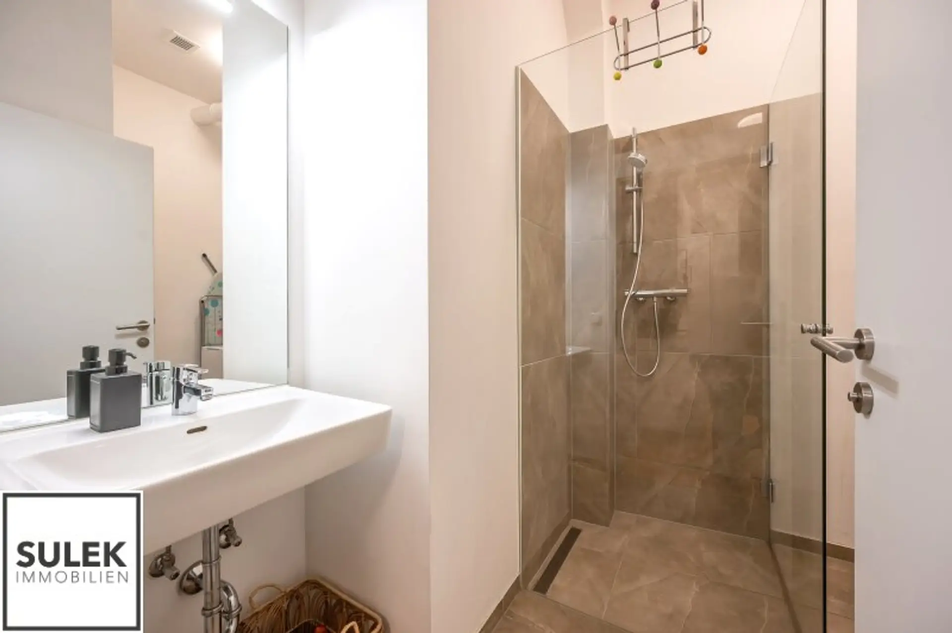 * ein Badezimmer mit ebenerdiger Walk-In Dusche, Handwaschbecken samt Spiegel und Waschmaschinen Anschluss