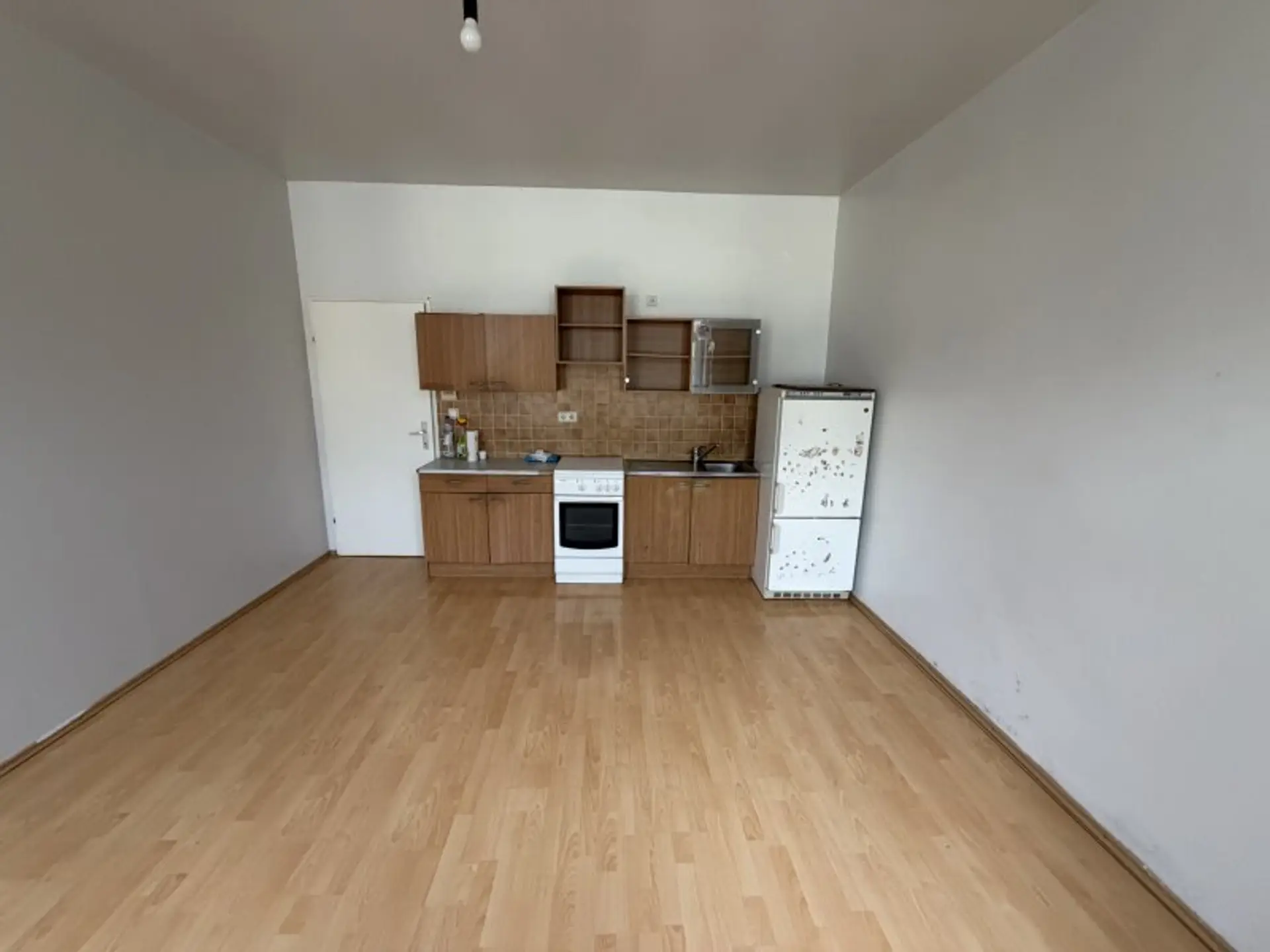 Die Wohnung umfasst eine Wohnfläche von 42 m². Der Wohnbereich verfügt – typisch für Gebäude dieses Baujahres – über einen Kaminanschluss, der sich ideal für einen kleinen Holzofen eignet. Die Küchenzeile ist harmonisch in den Wohnraum integriert.