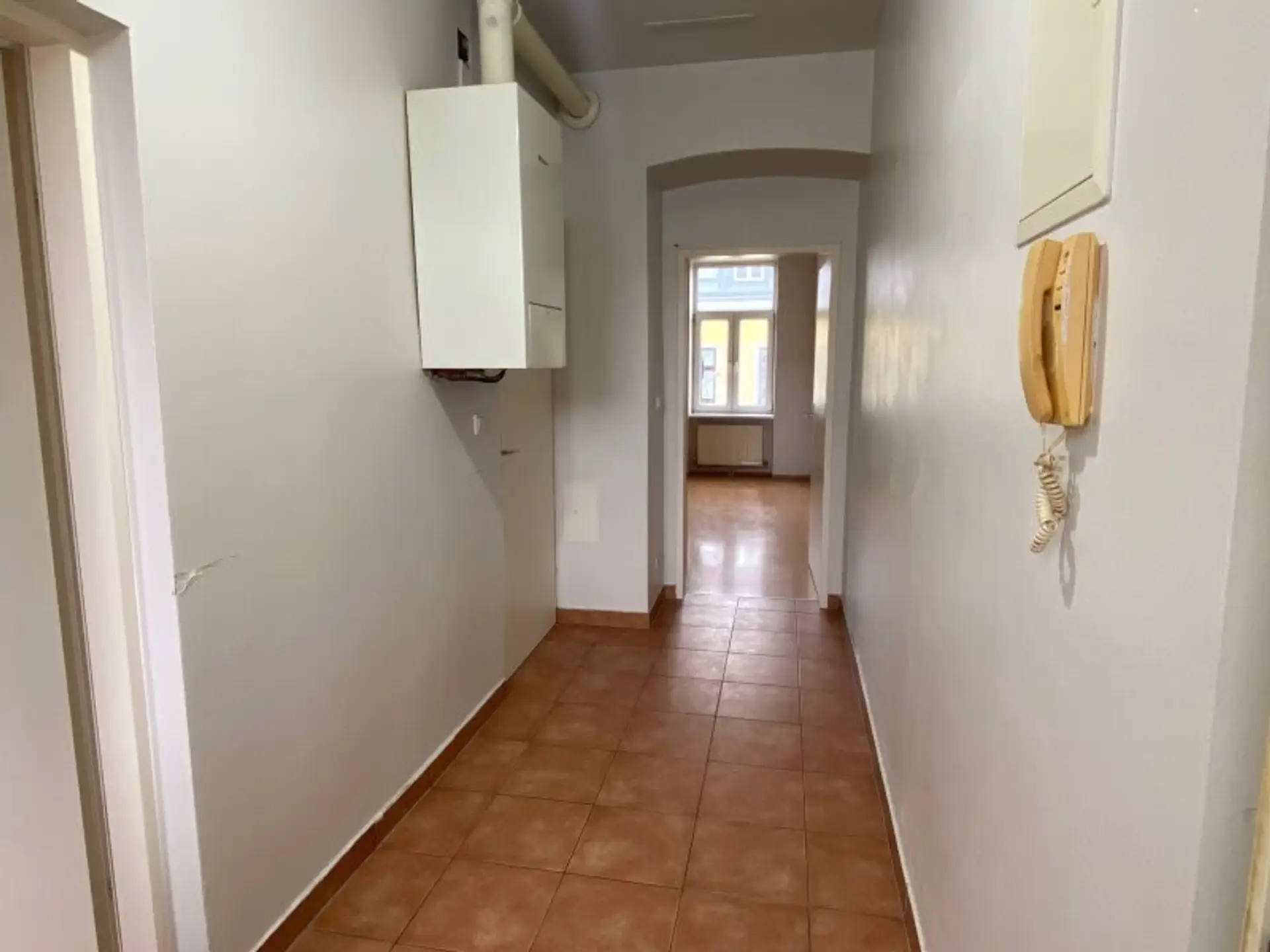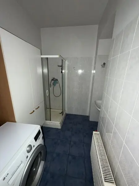 Beim Betreten der Wohnung gelangen Sie in den Vorraum. Linkerhand befindet sich das separate WC mit Handwaschbecken. Schräg rechts vom Eingangsbereich liegt das großzügige Badezimmer, ausgestattet mit Dusche, Waschtisch, Waschmaschinenanschluss sowie einer Gastherme.