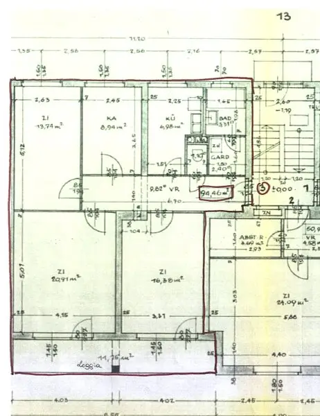 Die Wohnung besteht aus Vorraum/Gang, Wohnzimmer, Schlafzimmer, 2 weiteren Zimmern, Küche, Garderobe/Abstellraum, Bad mit Dusche und Fenster, getrennter Toilette,