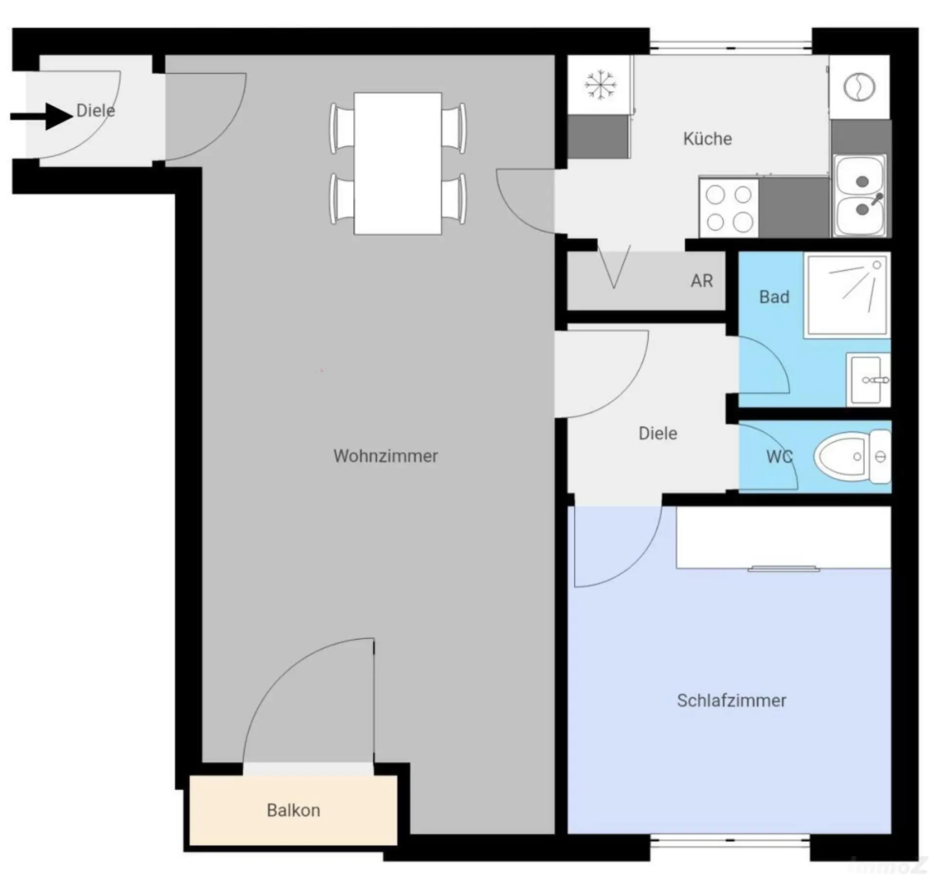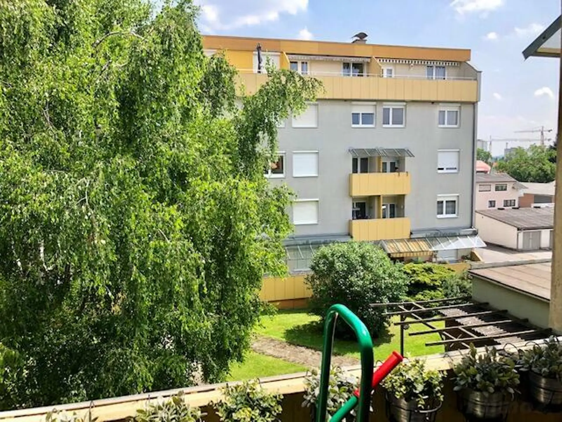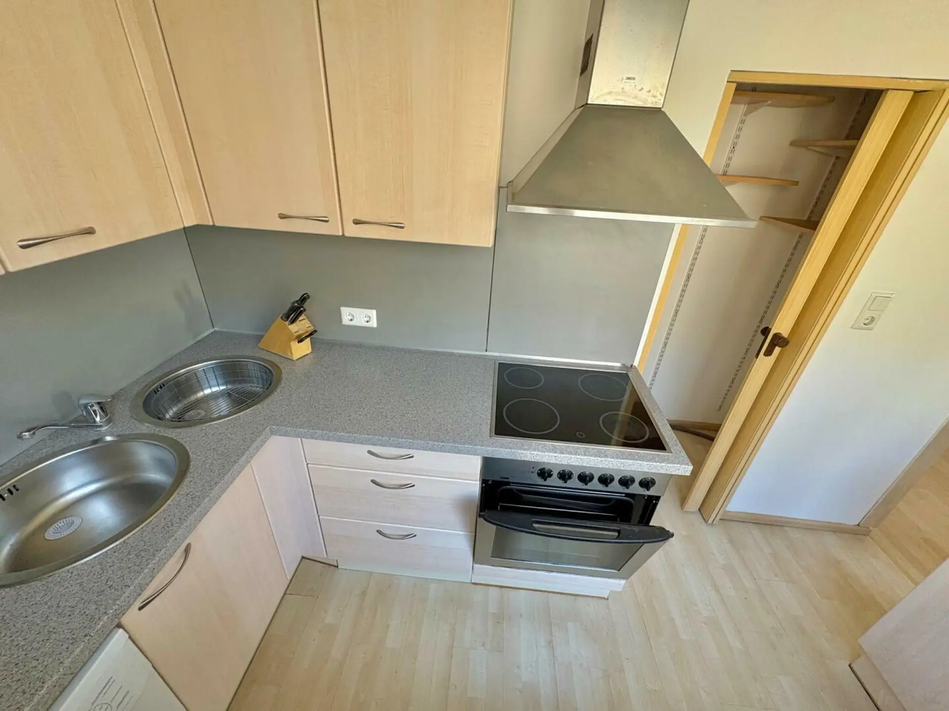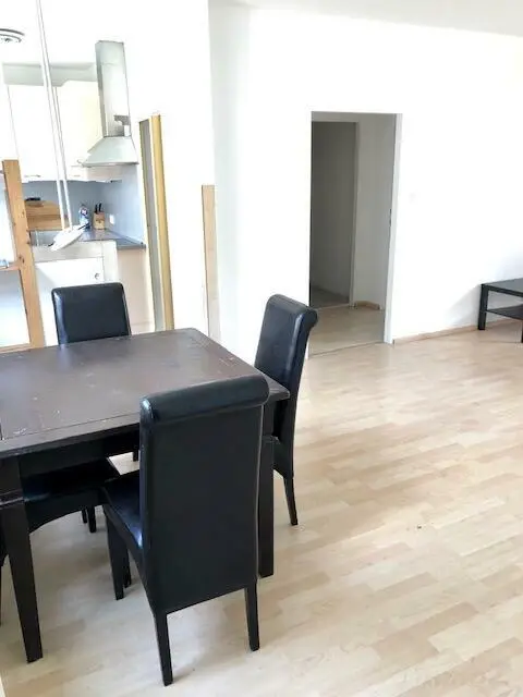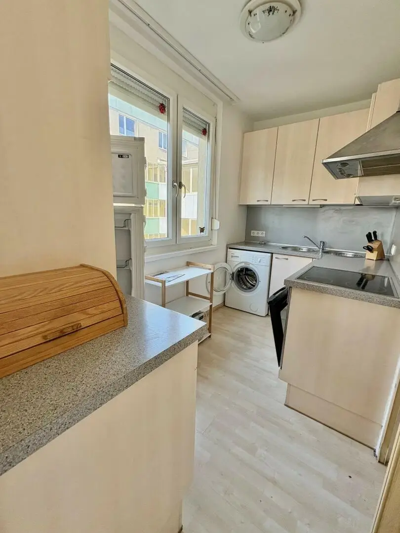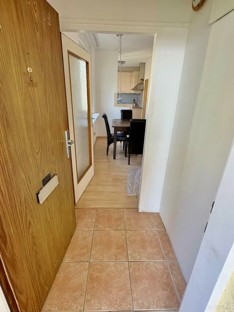 Vorraum, Wohn-Esszimmer mit Ausgang auf einen kleinen, ostseitigen Balkon in den Innenhof. Zugang zur möblierten Küche mit Speis. Ein weiterer kleiner Vorraum trennt den Sanitärbereich (Badezimmer und extra WC) und das Schlafzimmer vom Wohnbereich. Die Wohnung wird mit einer Elektroheizung beheizt. Der gesamte Stromverbrauch für Heizung + allgemein liegt bei ca. 100 € - somit ist die Gesamtmiete bei ca. 750 € (Miete, BK, HK + Strom).