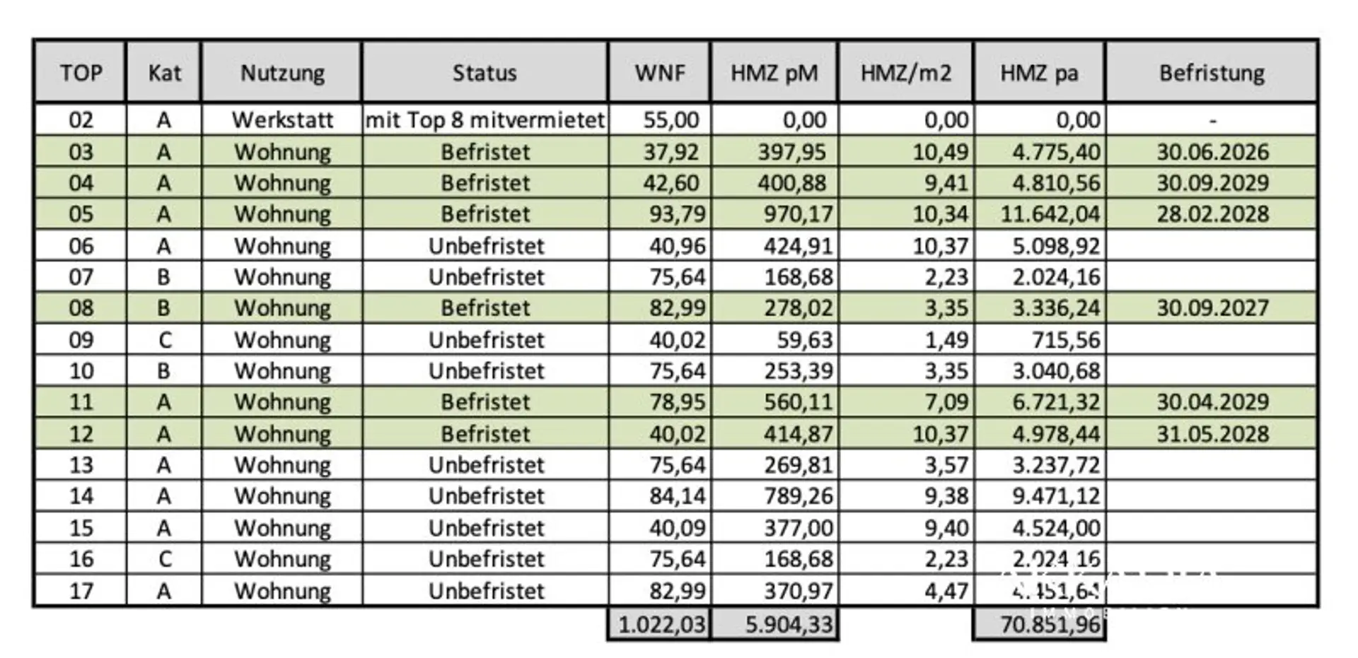 Das Haus überzeugt durch seine solide Bausubstanz und bietet mit insgesamt 16 Einheiten auf rund 1.022 m² Nutzfläche ein attraktives Fundament für nachhaltige Wertsteigerung. Ein Teil der Wohnungen – 6 Einheiten mit zusammen 376,27 m² – ist derzeit befristet vermietet und eröffnet somit mittelfristig spannendes Entwicklungspotenzial.