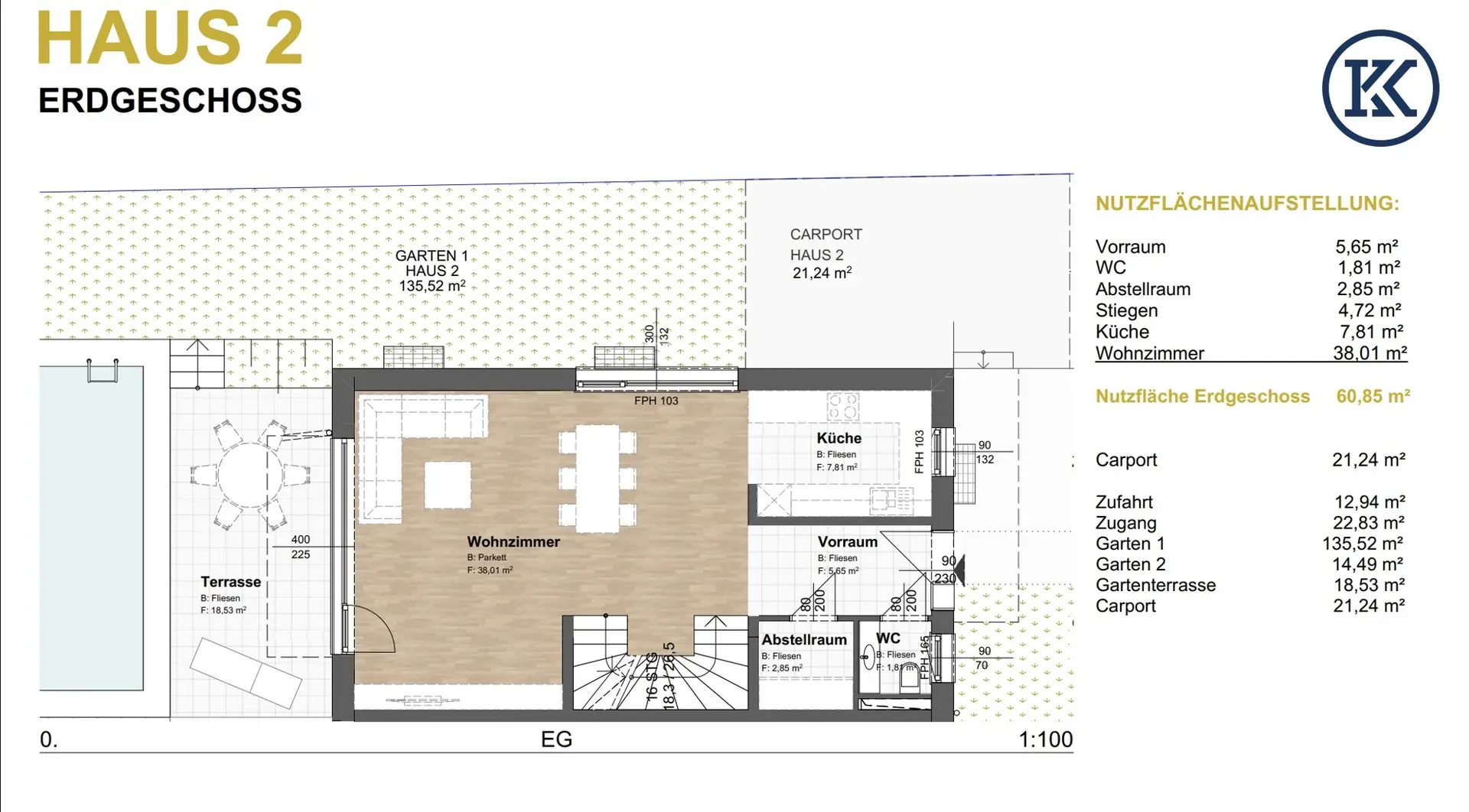Ausstattung: Boden Wohnküche / offene Küche Bad Gäste-WC Klimaanlage Fußbodenheizung Terrasse Garten