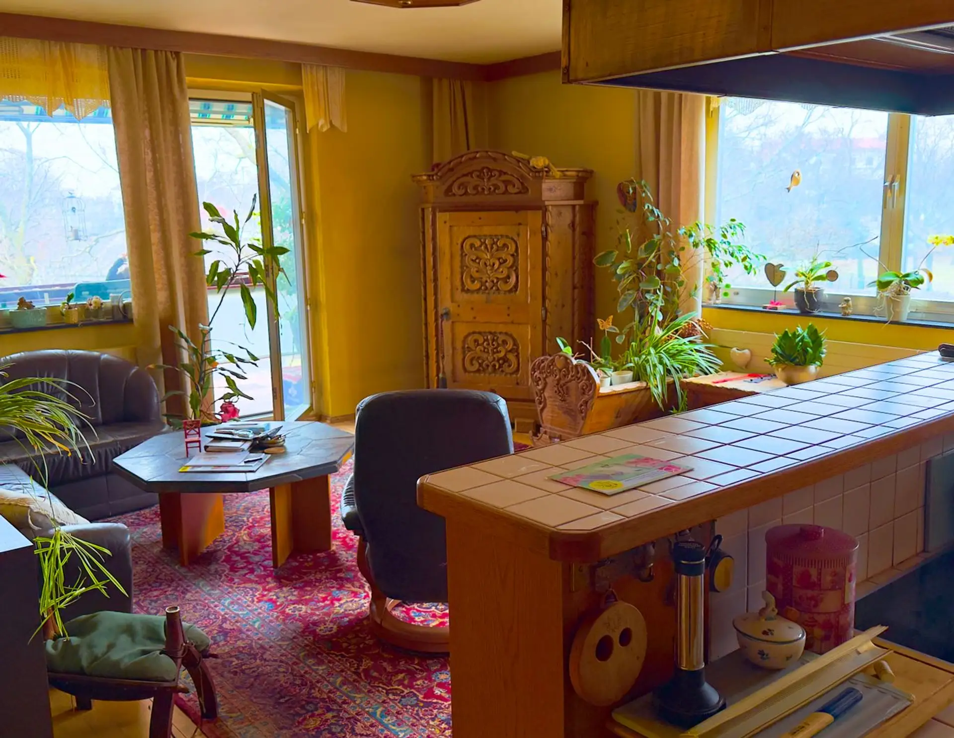 Großes Wohnzimmer mit offener EWE Küche mit Miele Geräten, Runddusche, inklusive Abstellplatz, Heizkosten und Warmwasserpauschale inklusive. Zur Zeit möbliert nach Absprache.