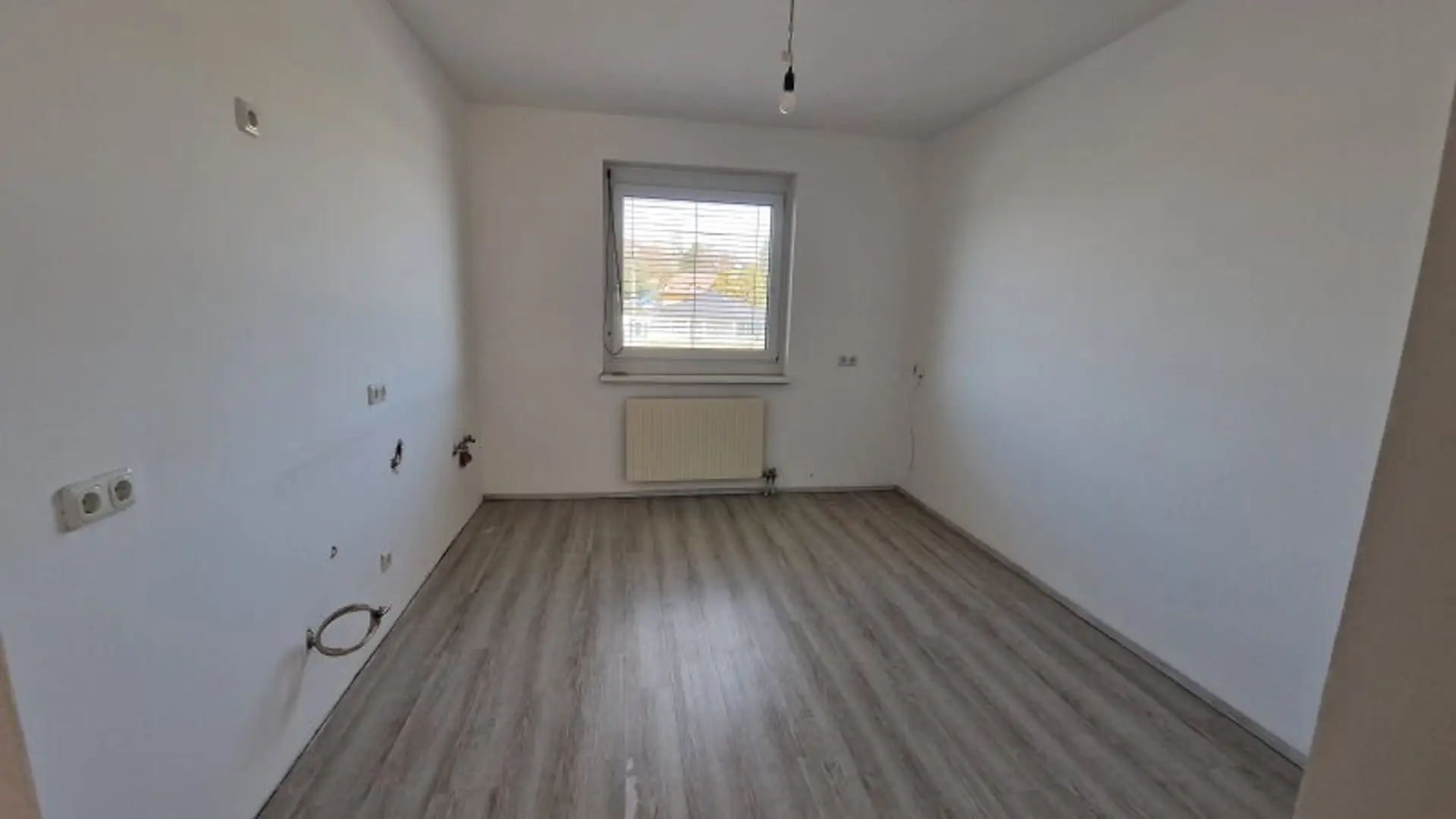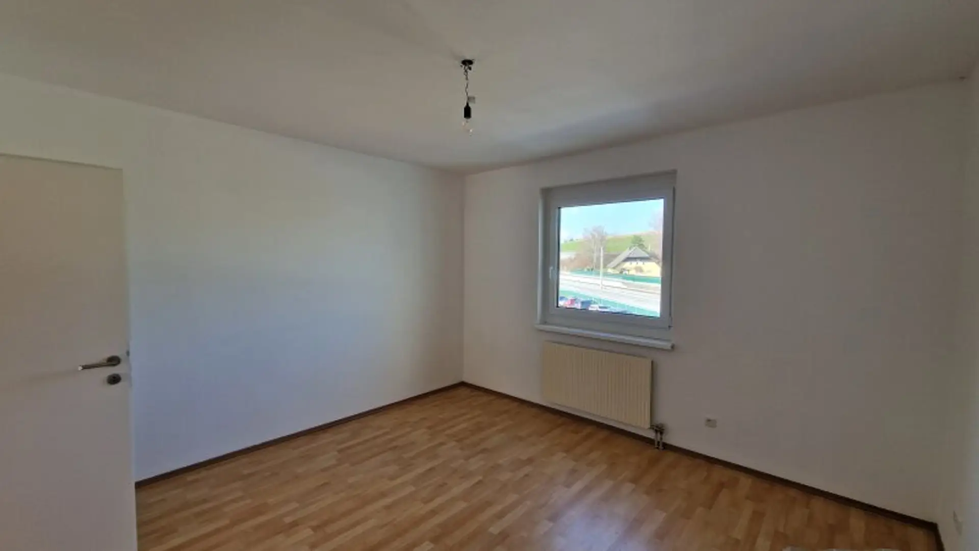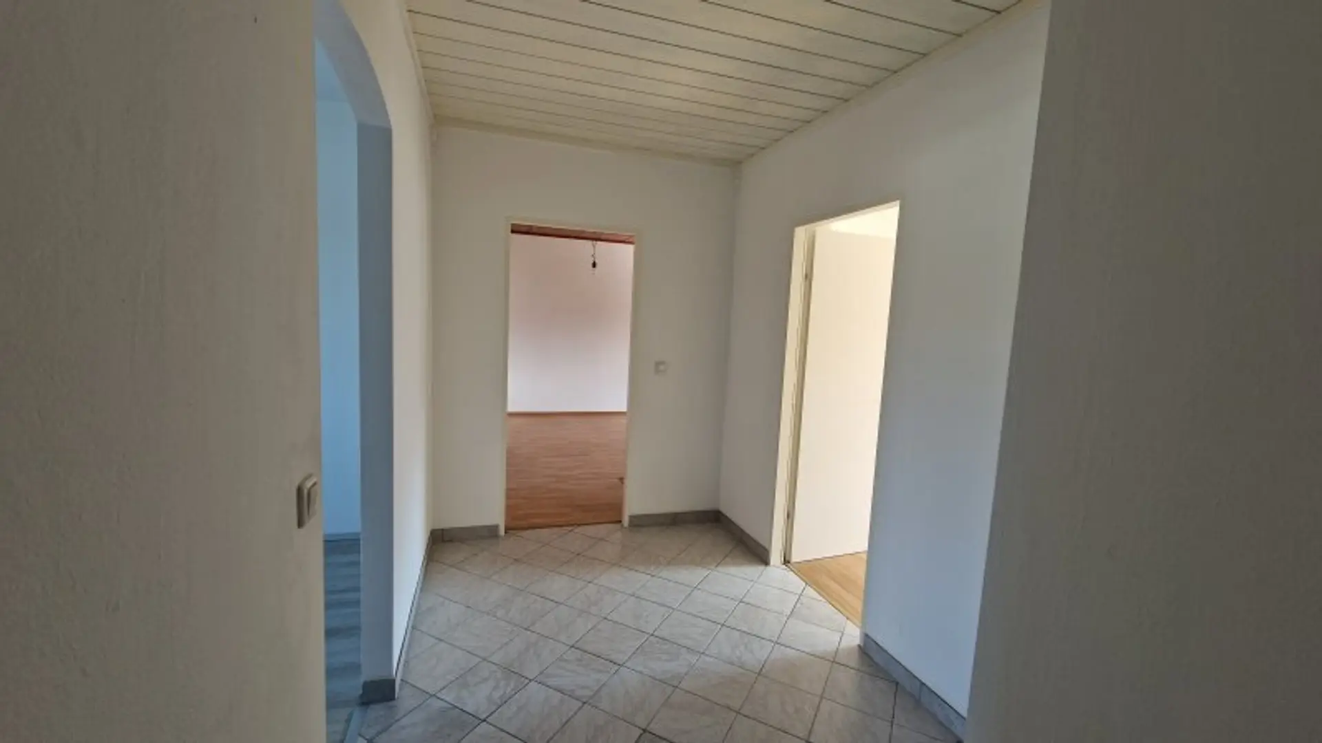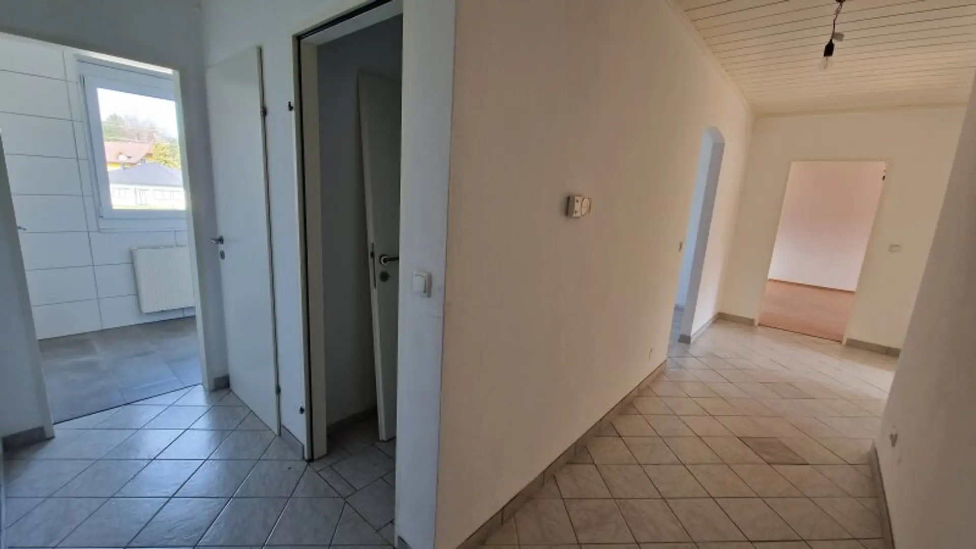 Die Raumaufteilung ist besonders praktisch: Der Vorraum verbindet zentral alle Räume – mit Ausnahme des Hauptschlafzimmers, das über das Wohnzimmer zugänglich ist. Dazu gehören das Bad, ein separates WC, ein Abstellraum, die unmöblierte Küche, ein Kinderzimmer sowie das Wohnzimmer.