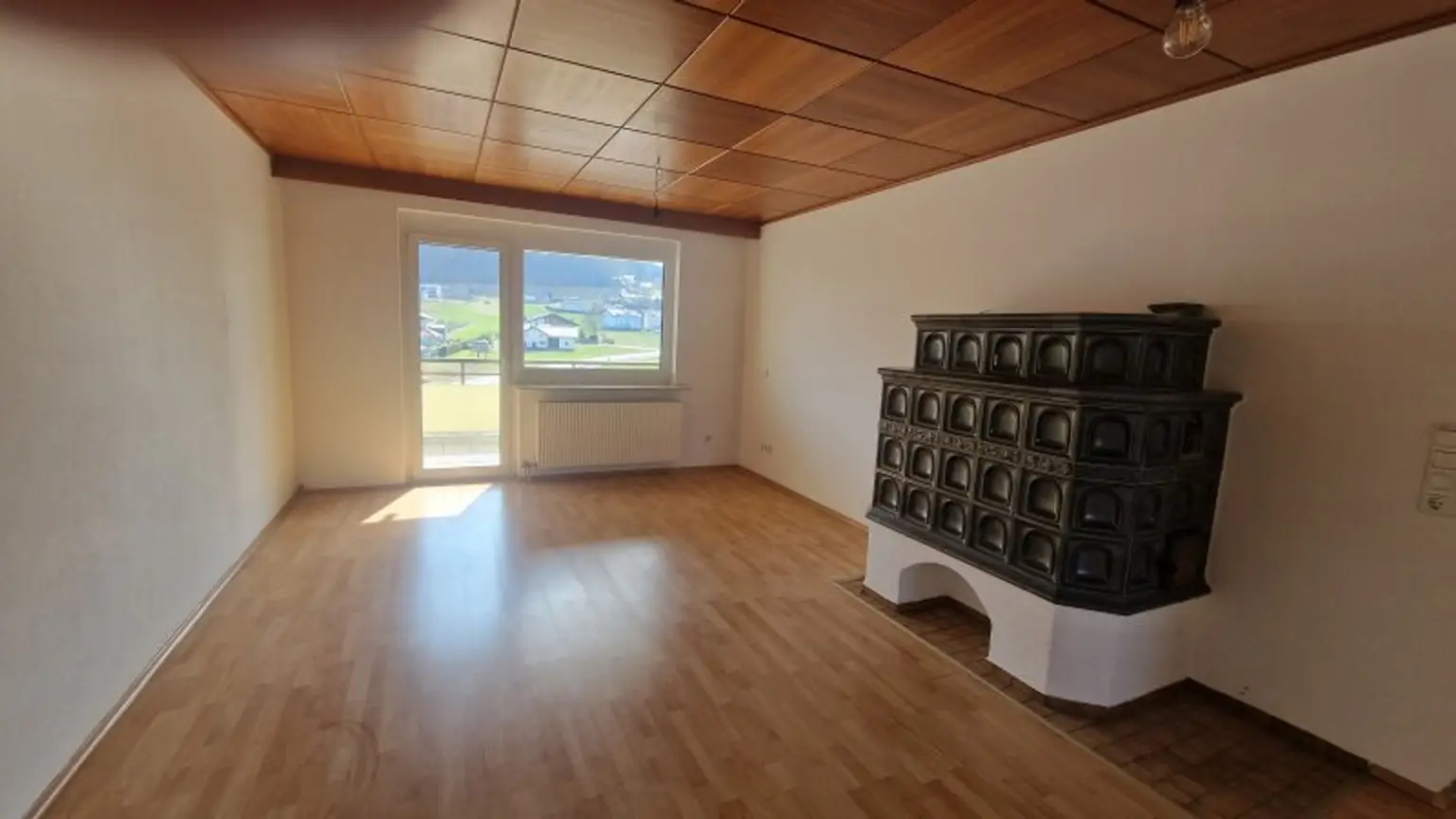 Das freundlich helle Wohnzimmer verfügt über einen schönen Kachelofen und einen Zugang zur großen Loggia.