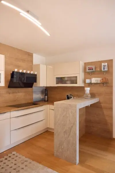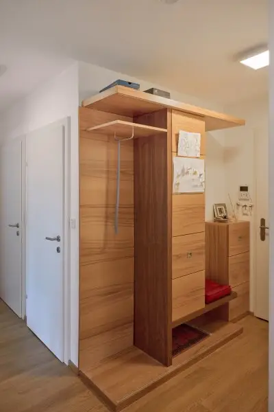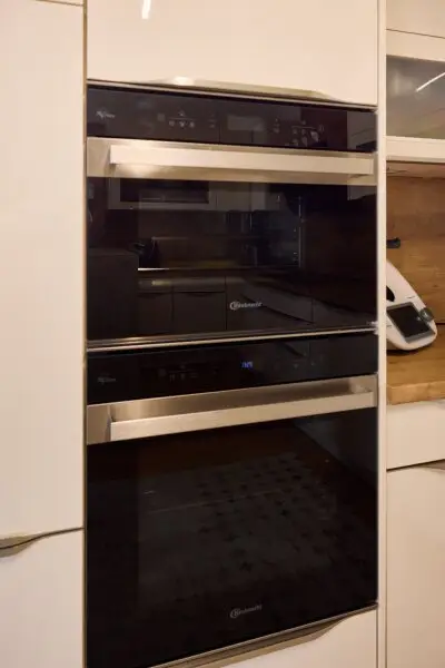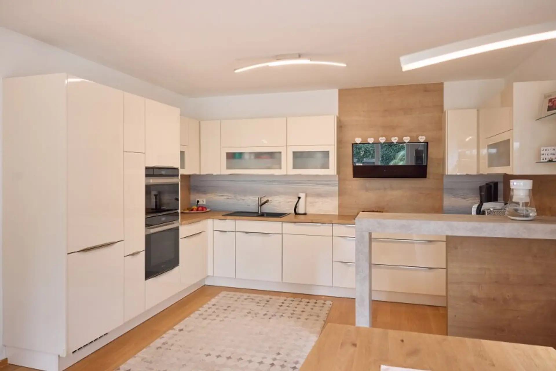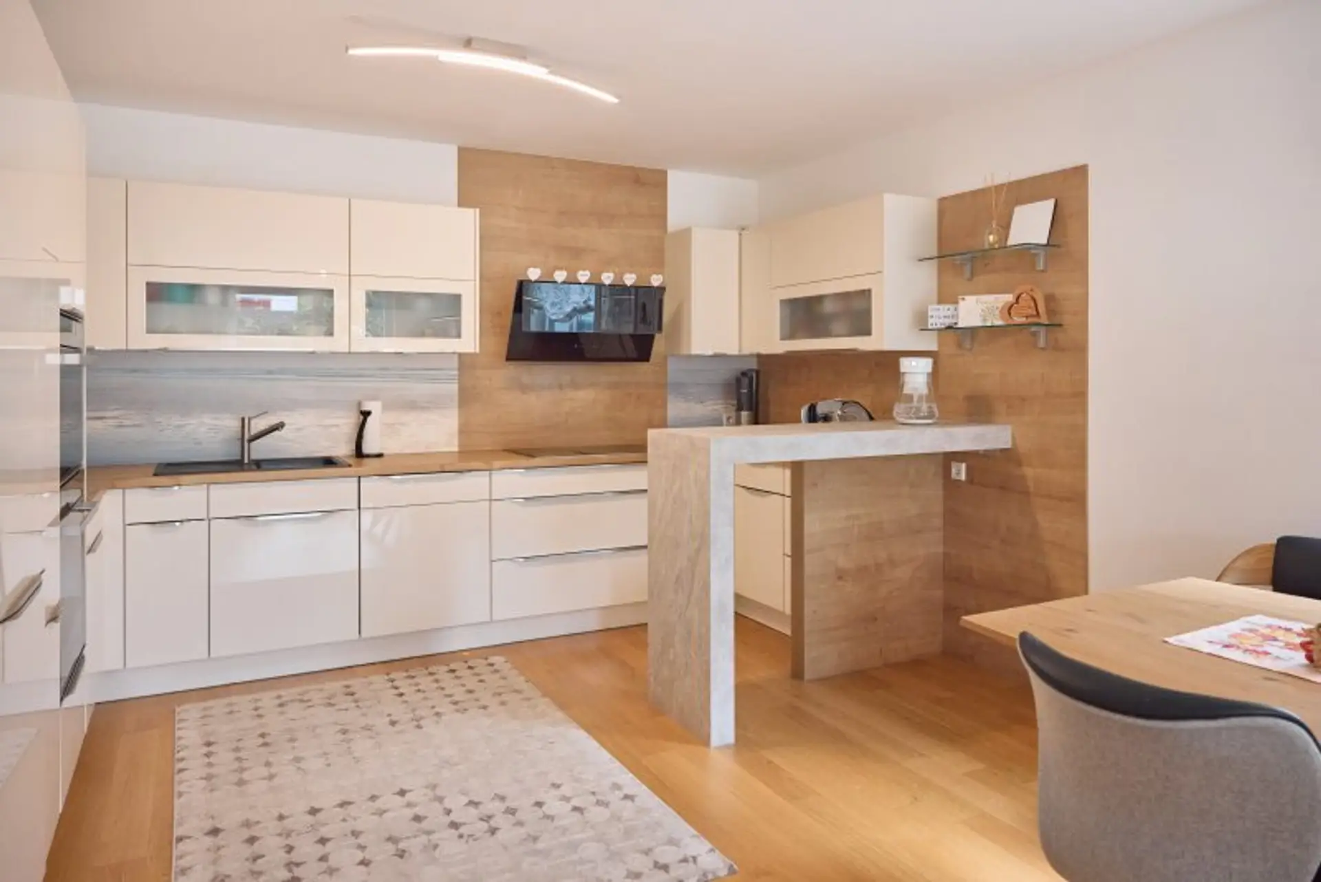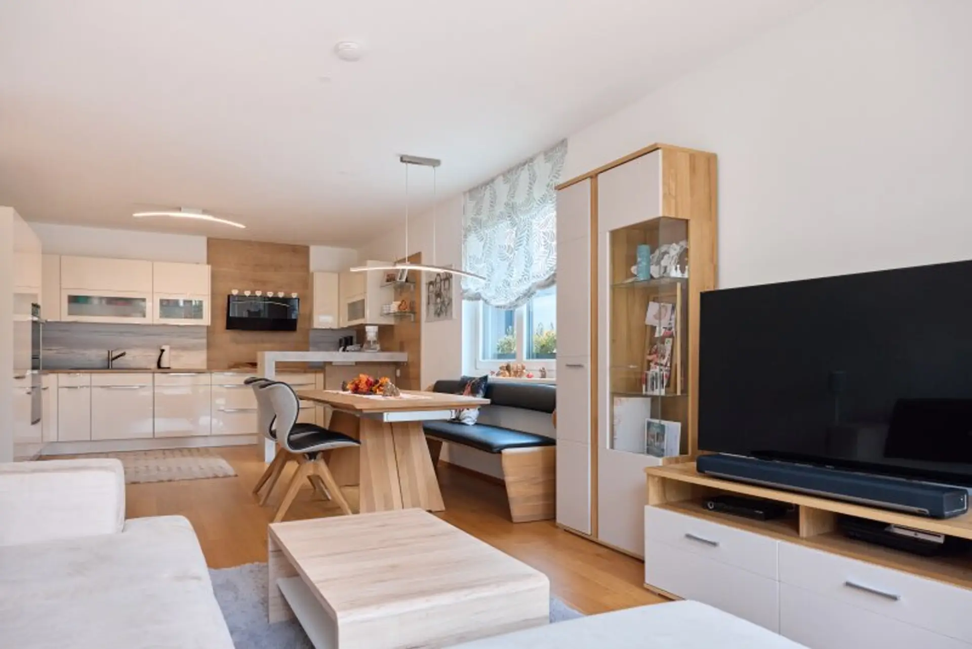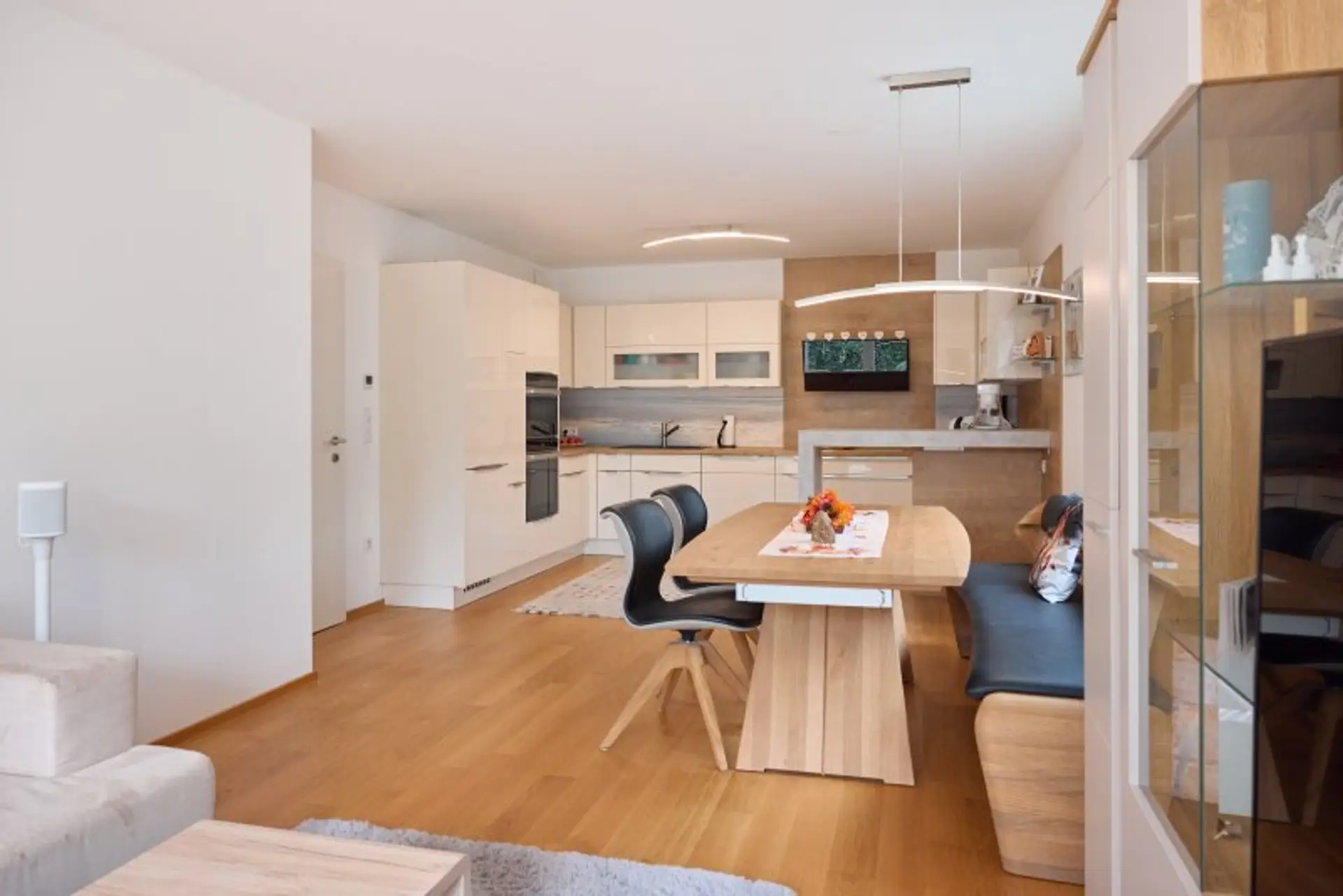 Über das zentrale Vorzimmer gelangt man links in die moderne, mit Bauknecht-Geräten ausgestattete Küche (Geschirrspüler, Kühl-Gefrierkombination, Dampfgarer, Herd und Backrohr) samt Dunstabzug von Falmec und weiter in das helle Wohnzimmer.