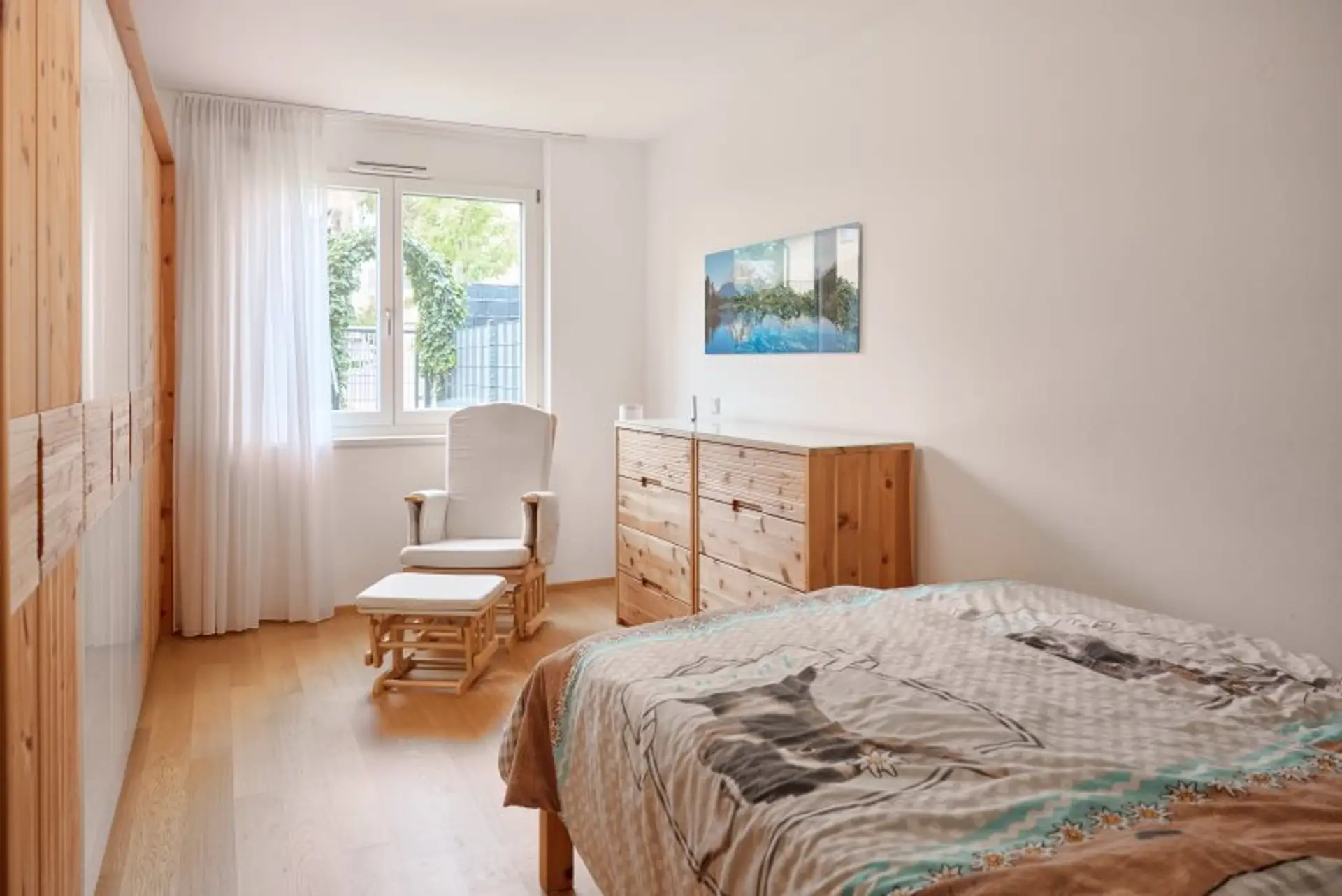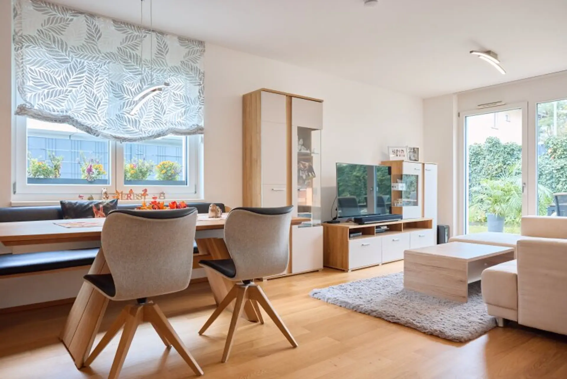 Wohnzimmer und Schlafzimmer sind westseitig ausgerichtet, die Wohnküche verfügt zusätzlich über ein südseitiges Fenster mit Blick in den eigenen Garten. Alle Wohnräume sind mit hochwertigen Parkettböden ausgestattet.