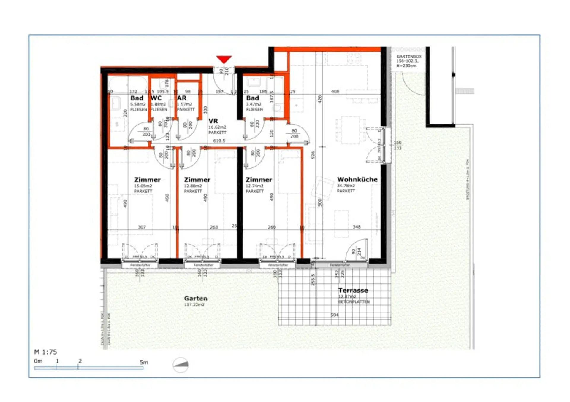 Das Besondere an dieser 4-Zimmer-Neubauwohnung ist der rund 120m² große Eigengarten, der zur ausschließlichen Nutzung zur Verfügung steht. Davon entfallen ca. 107m² auf die Gartenfläche und ca. 13m² auf die Terrasse. Der Garten verfügt zusätzlich über einen praktischen straßenseitigen Zugang sowie eine Gartenbox.