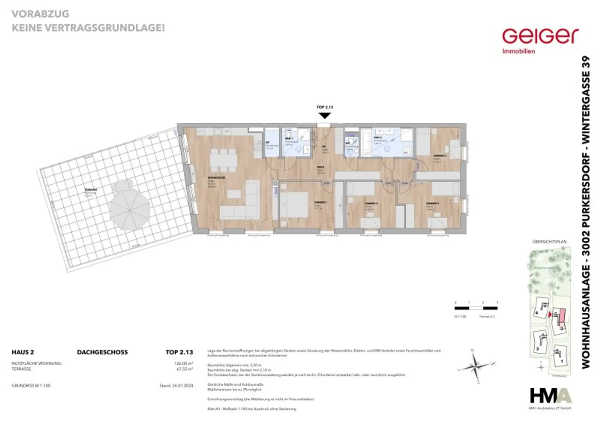 In der zentrumsnahen Wintergasse 39 im beliebten Purkersdorf, errichten wir eine moderne Wohnhausanlage. Diese fügt sich harmonisch in den Hang ein, besteht aus 4 Wohnhäusern mit insgesamt 48 Wohnungen (2-, 3-, 4- und 5-Zimmer Wohnungen), 74 KFZ-Tiefgaragenplätzen, sowie 8 Stellplätzen für Motorräder.