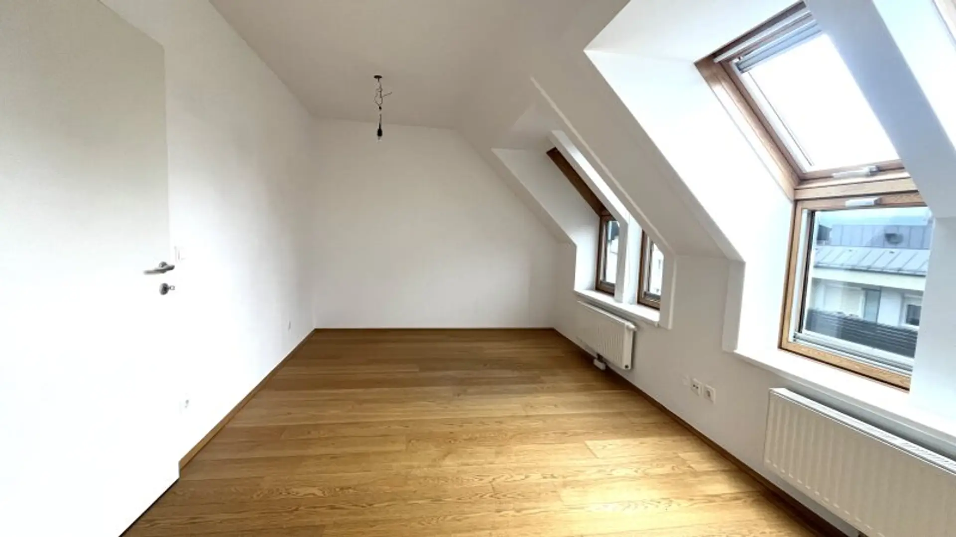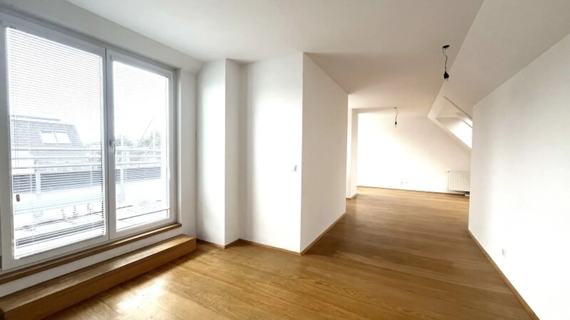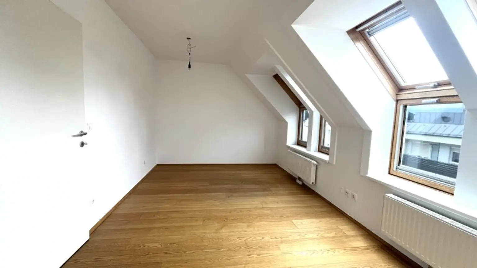 Der erste Schlafraum wirkt aufgrund der vielen Dach-Fenster sehr außergewöhnlich und bietet dank einer Größe von fast 17 m² genug Möglichkeiten, um neben einem geräumigen Doppelbett auch einen großzügigen Kleiderschrank zu platzieren. Die kleine aber feine Terrasse ist perfekt, um nach einer erholsamen Nacht bei frischer Luft in den Tag zu starten.
