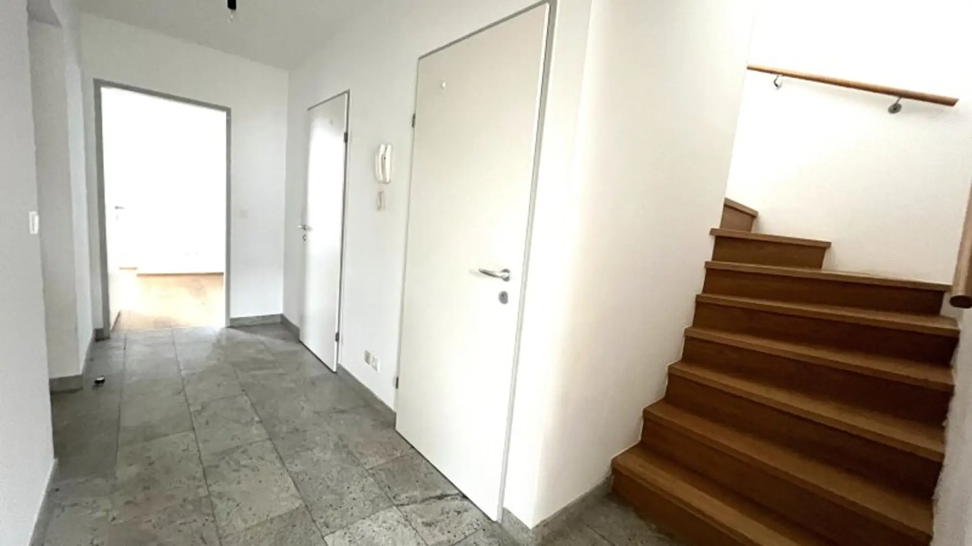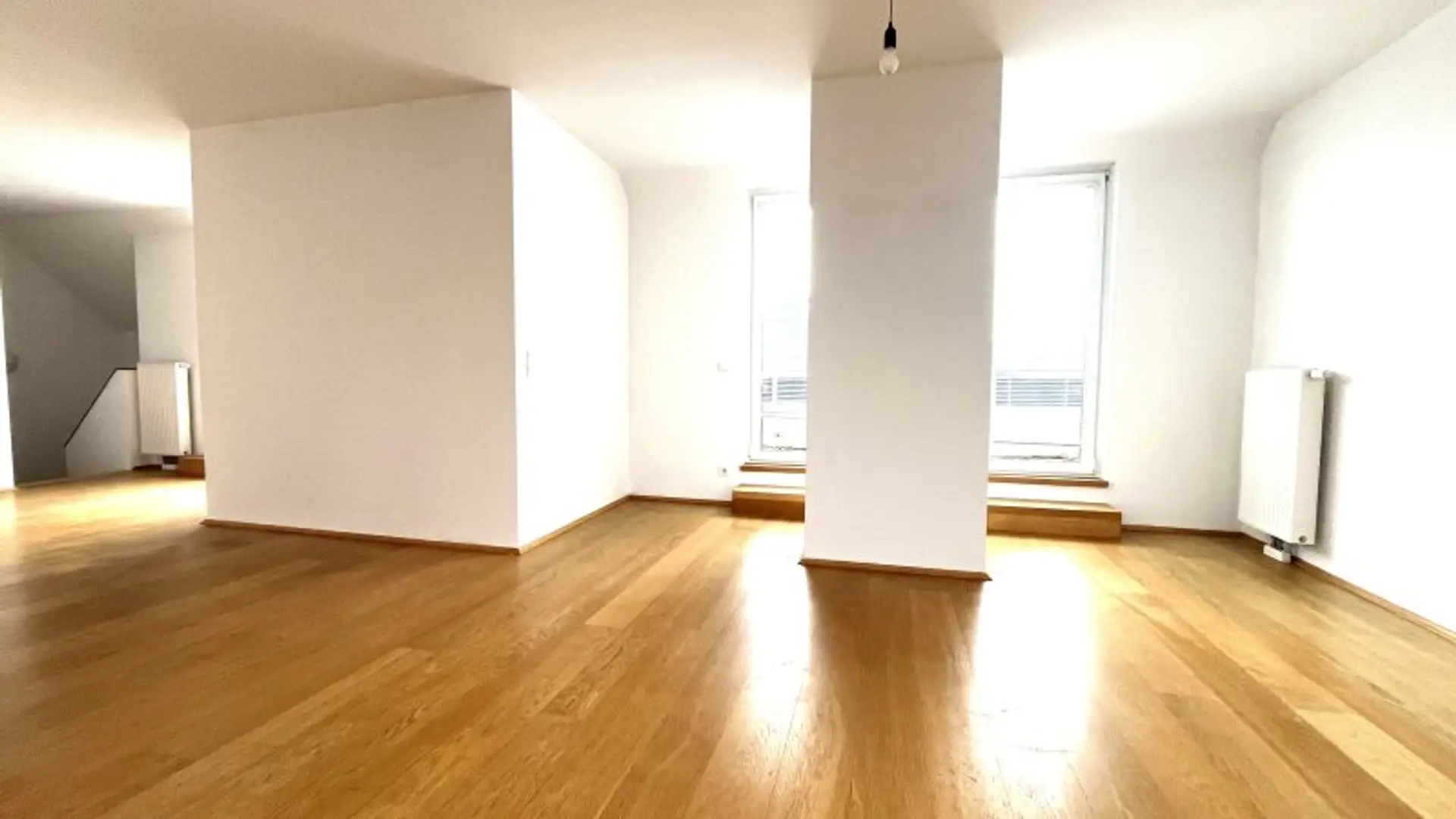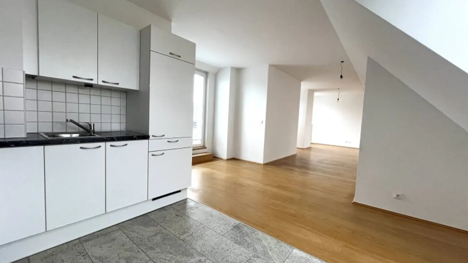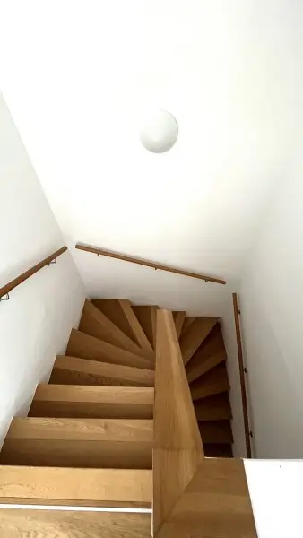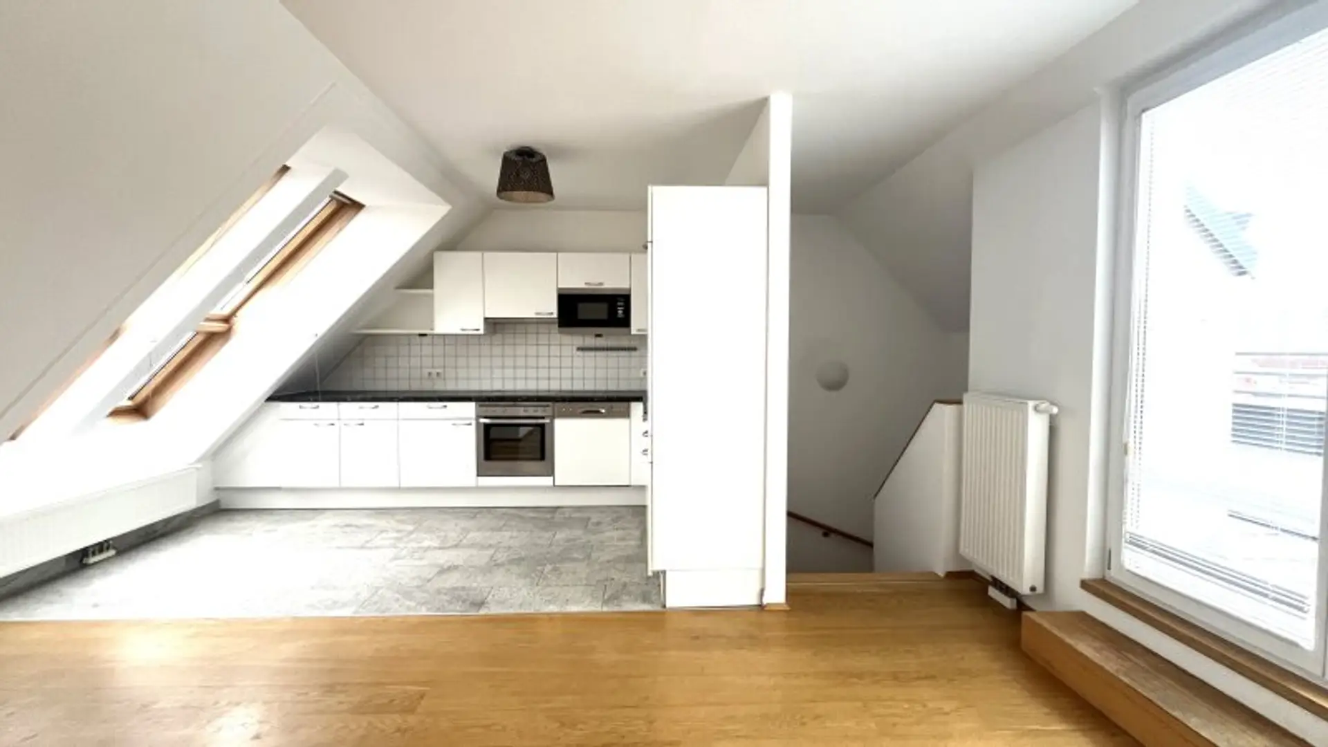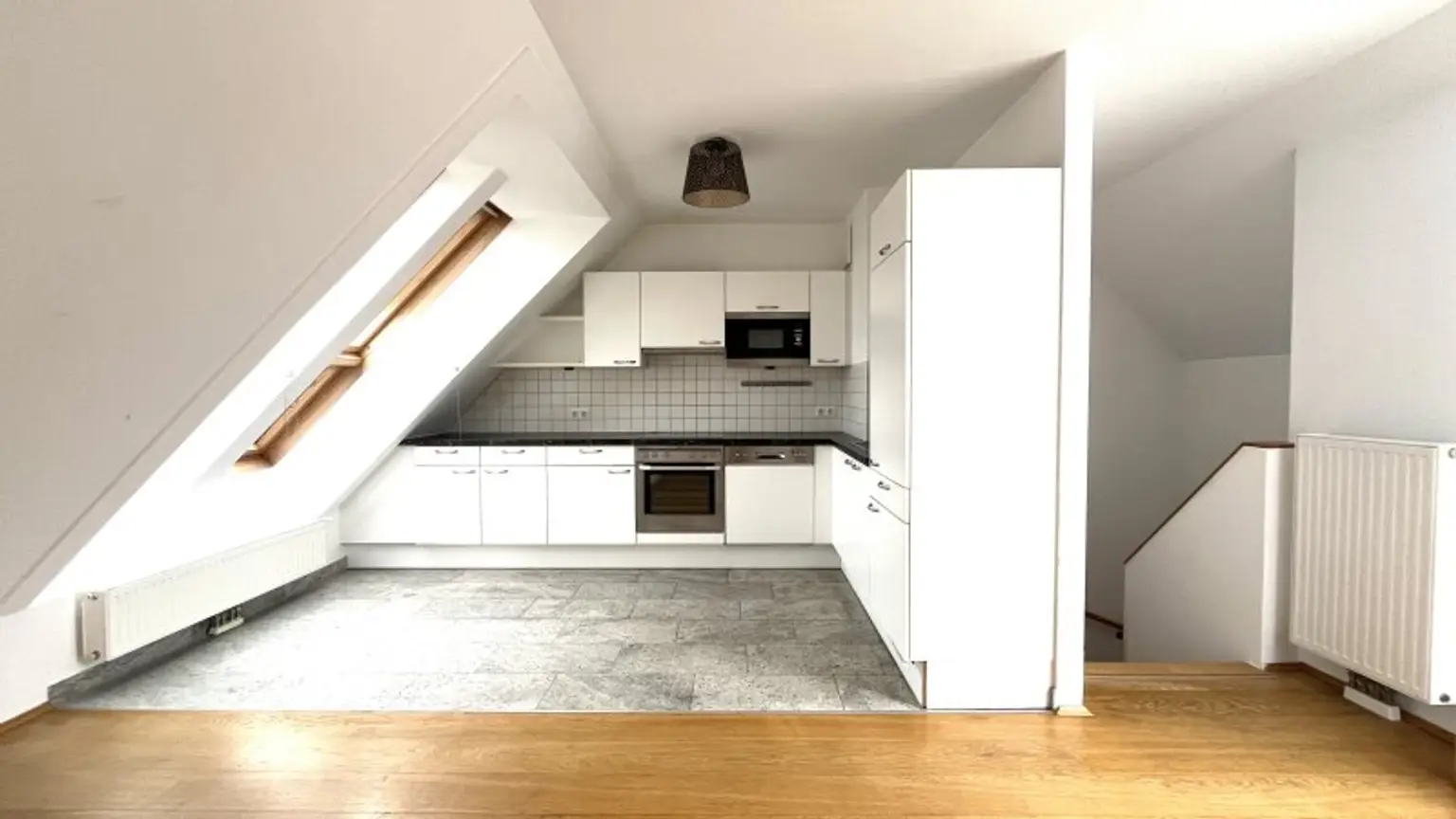 Vom Vorraum aus gelangt man über eine wunderschöne mit Holz vertäfelte Treppe in das 2. Dachgeschoss der Maisonette Wohnung und befindet sich direkt in der traumhaften Wohnküche.