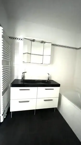 Das schöne Badezimmer liegt vis à vis vom Eingang und weist eine Größe von rund 5 m² auf. Es ist mit modernen Fliesen, einer Badewanne, einem Doppel-Waschtisch, einer Toilette und einem Waschmaschinenanschluss ausgestattet.