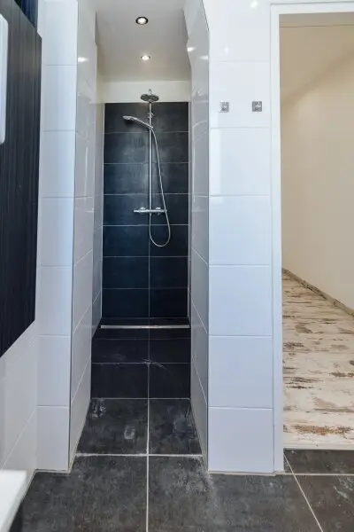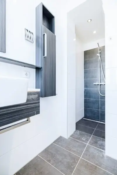 Das moderne Badezimmer ist mit einer eleganten Dusche ausgestattet und lädt zum Erfrischen und Wohlfühlen ein. Abgerundet wird das Angebot durch einen praktischen Abstellraum, der neben zusätzlichem Stauraum auch einen Waschmaschinenanschluss bietet – ein Komfort, den man im Alltag schnell zu schätzen weiß.