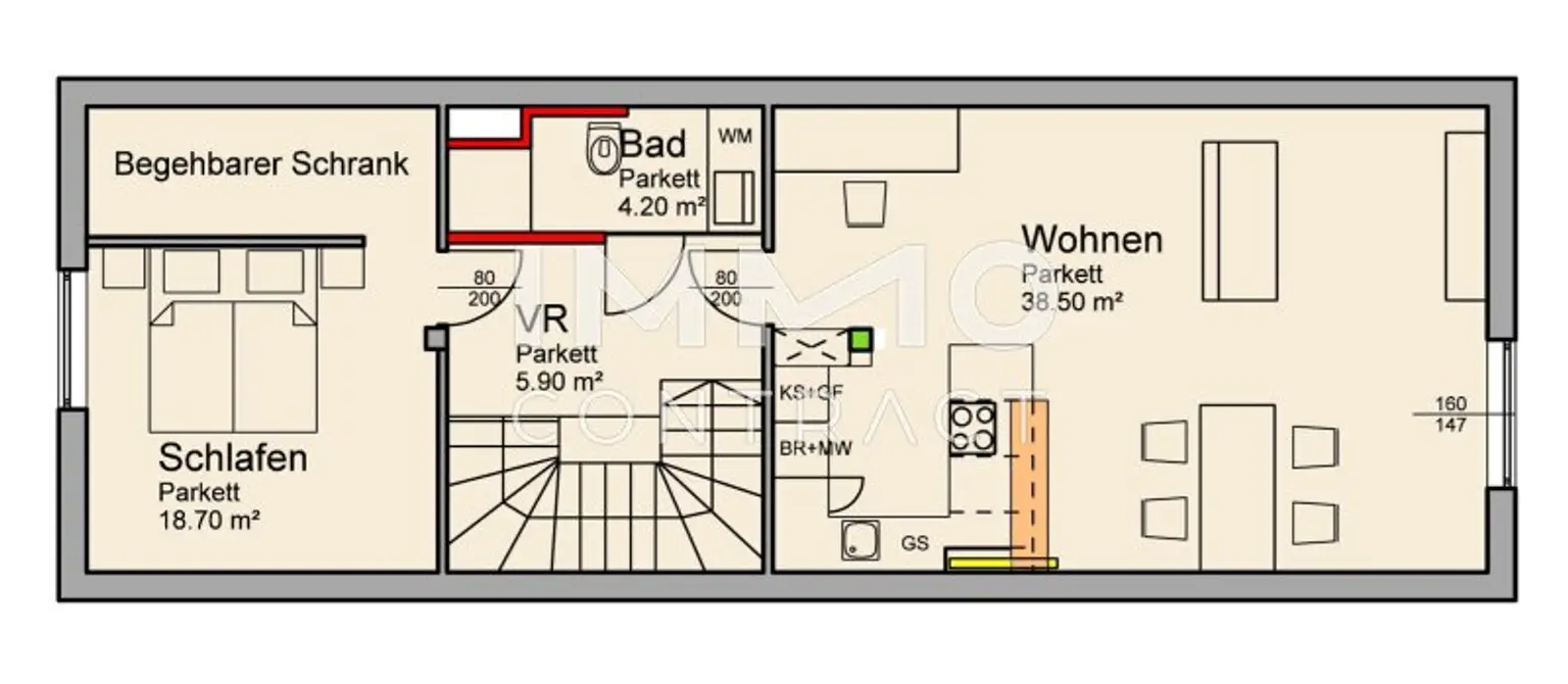 Die Wohnfläche gliedert sich auf in einen großzügigen, hellen Wohnraum mit offener Küche und Essbereich, ein Schlafzimmer mit Schrankraum , elegantes Duschbad mit Toilette und einem Vorraum. Alle Räume sind sehr hell und freundlich und laden somit zum Wohlfühlen ein!