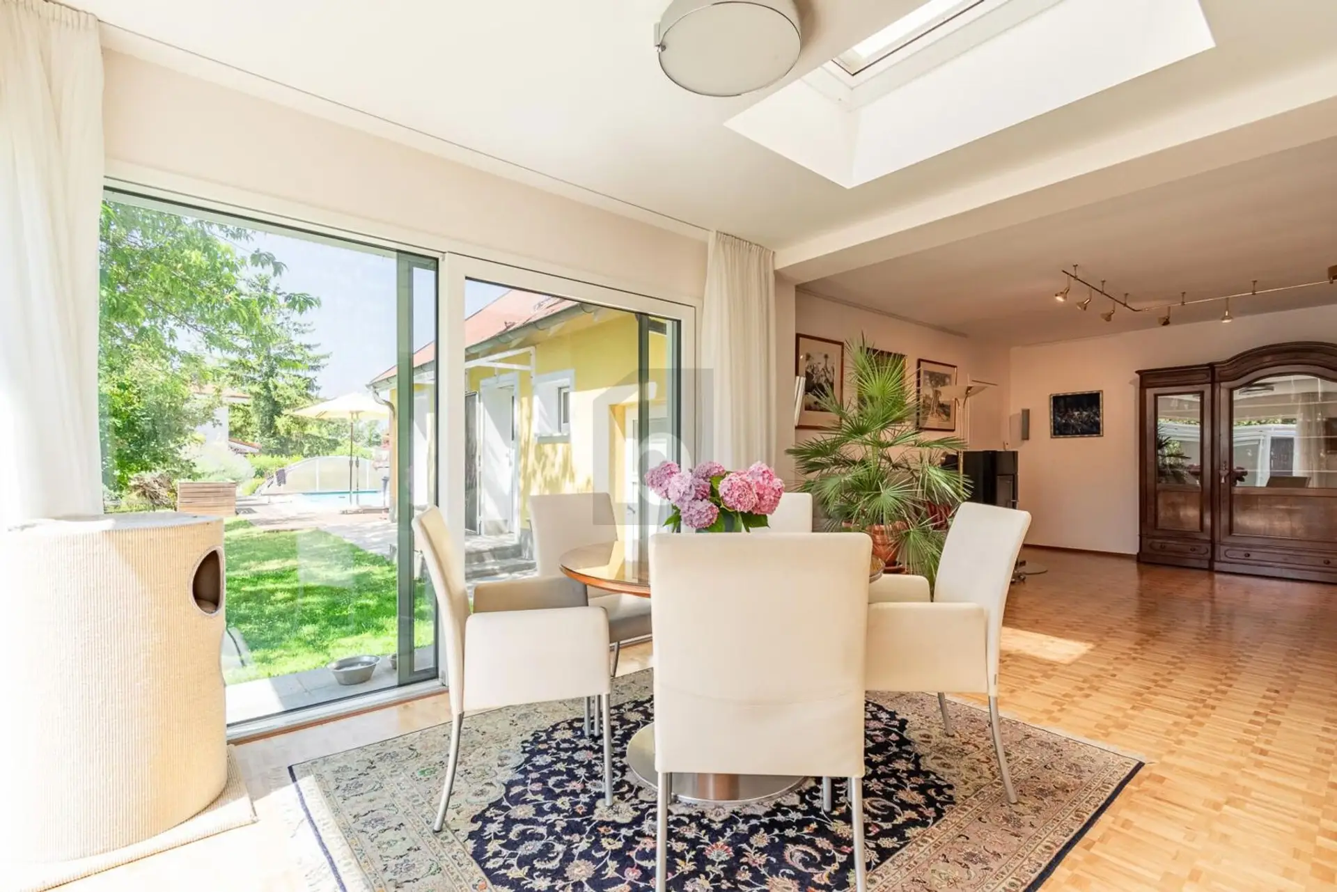- offener Küchen-Wohn-Essbereich mit großen Terrassentüren und herrlichem Blick in den Garten - ebenerdige Wohnfläche - zwei einzeln begehbare Schlafzimmer - eigener Gästetrakt bestehend aus Gästezimmer, Badezimmer, Terrasse und eigenem Eingang - ehemaliger Weinkeller - Pavillon mit Glaswänden - gepflegter Garten mit zweiter Zufahrt, Gemüsegarten, Obstbäumen und eigenem Brunnen - beheizbarer Pool von 8x3,5 m mit Überdachung - Alarmanlage - 2 gepflasterte Stellplätze und Garage - und, und, und...