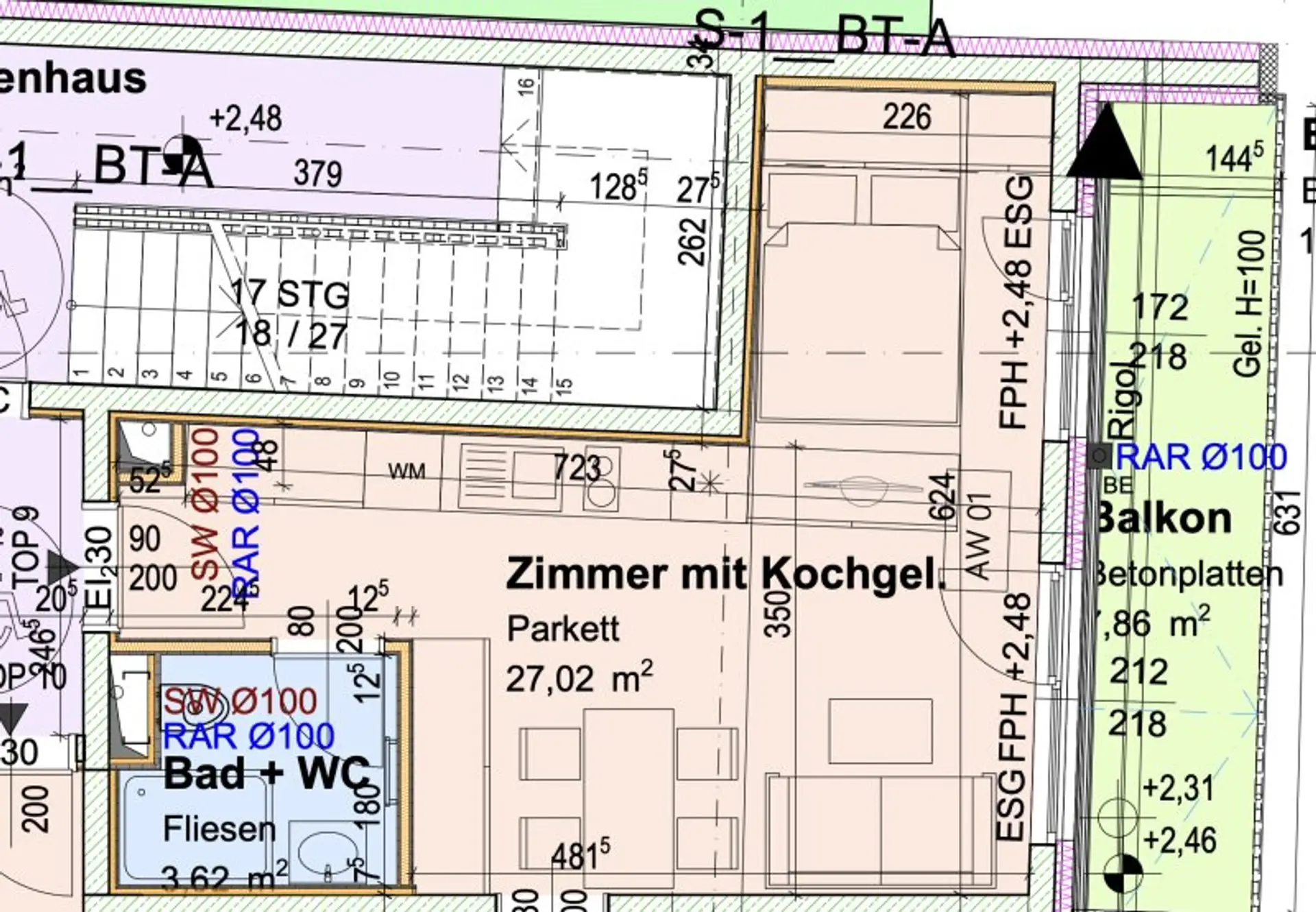 Sie betreten die Wohnung und stehen im Vorraum. Vom Vorraum aus gelangen Sie in die helle, lichtdurchflutete 31 m² große Wohnküche. Hier befindet sich ebenfalls der Zugang zum Schlafzimmer. Rechts befindet das Badezimmer mit Dusche und Waschtisch, WM Anschluss, sowie dem WC.