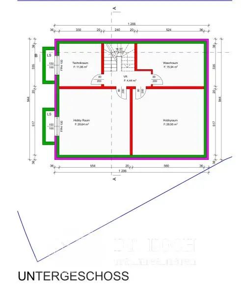 Der ca. 89m² große Keller umfasst einen Technikraum, einen großzügigen Waschraum und zwei geräumige Hobbyräume, die viele Möglichkeiten bieten.