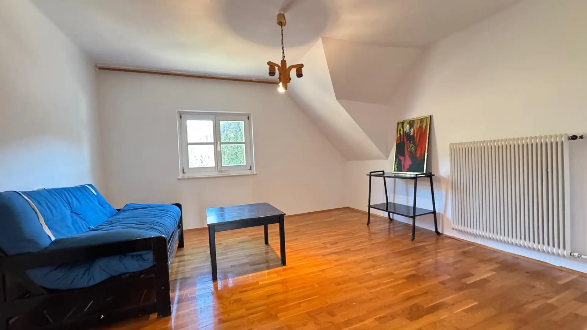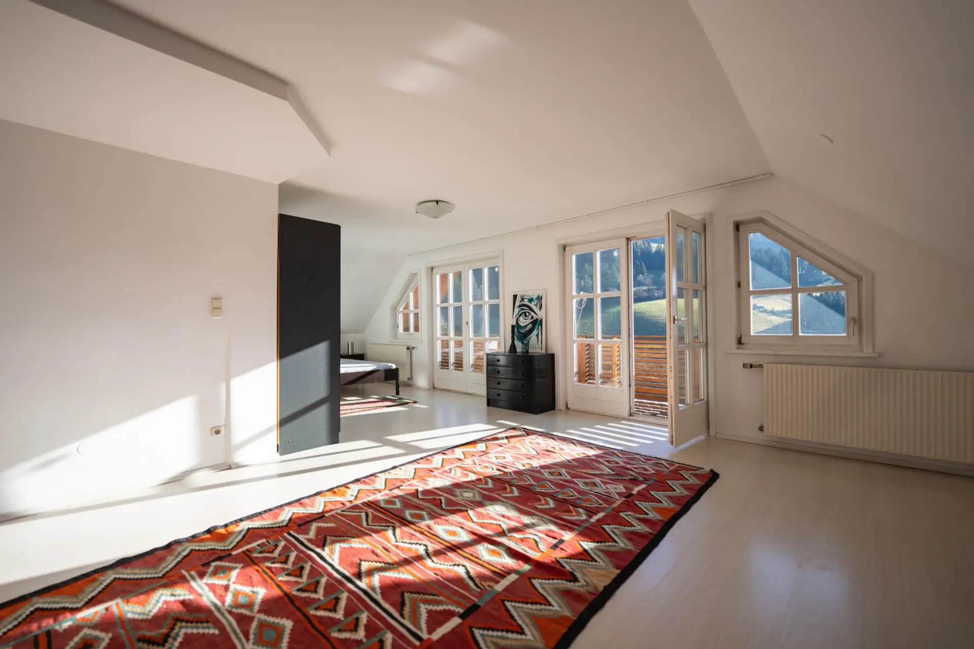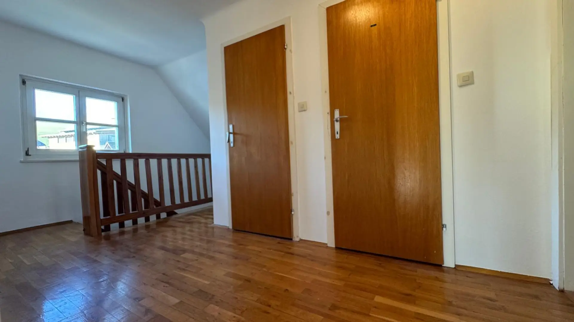 Besonders hervorzuheben ist der weitläufige Wohnbereich im Obergeschoss, von dem aus man den Balkon erreicht und einen schönen Ausblick ins Grüne genießt.