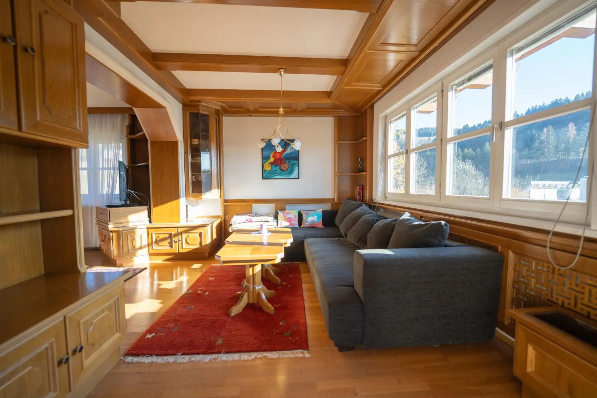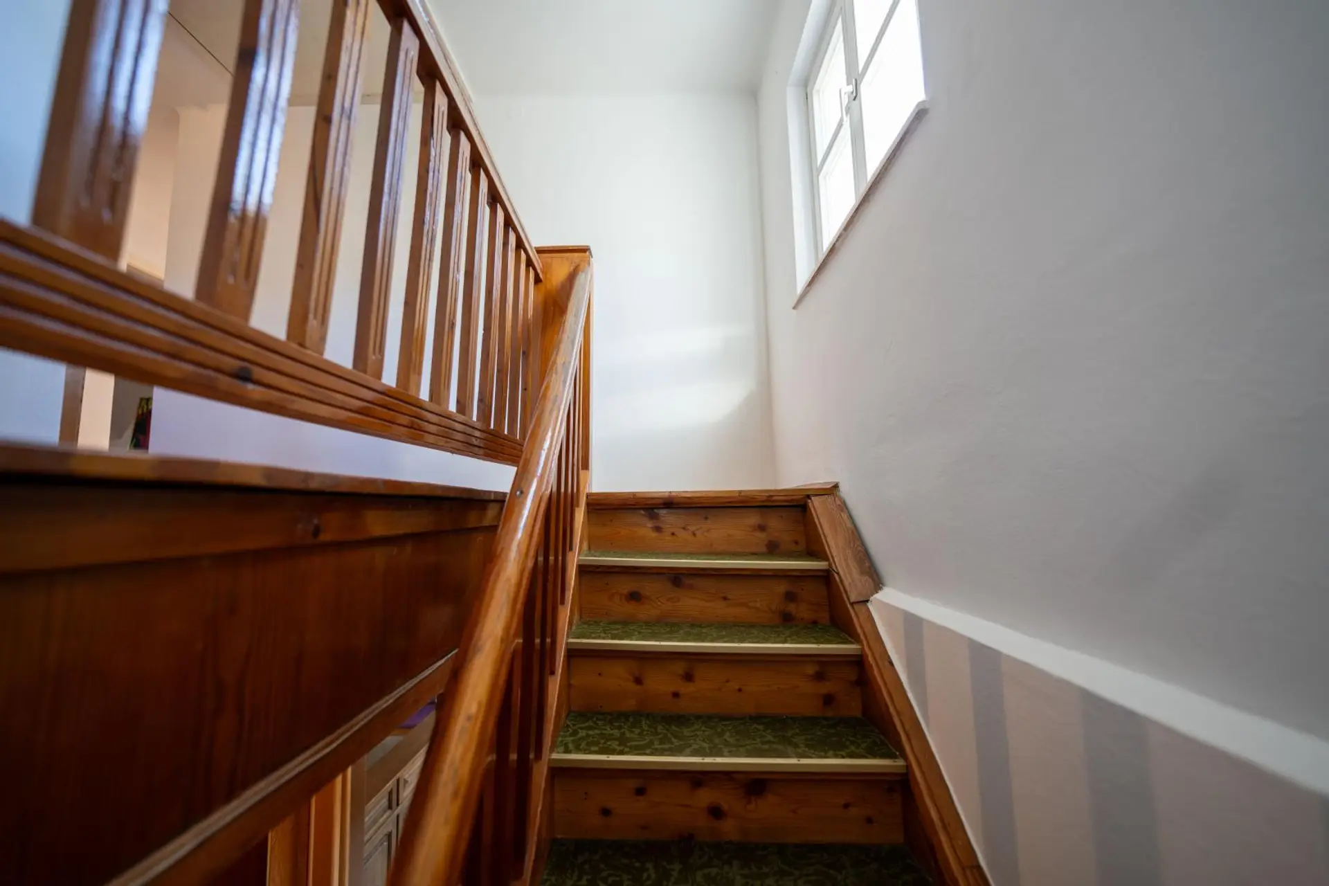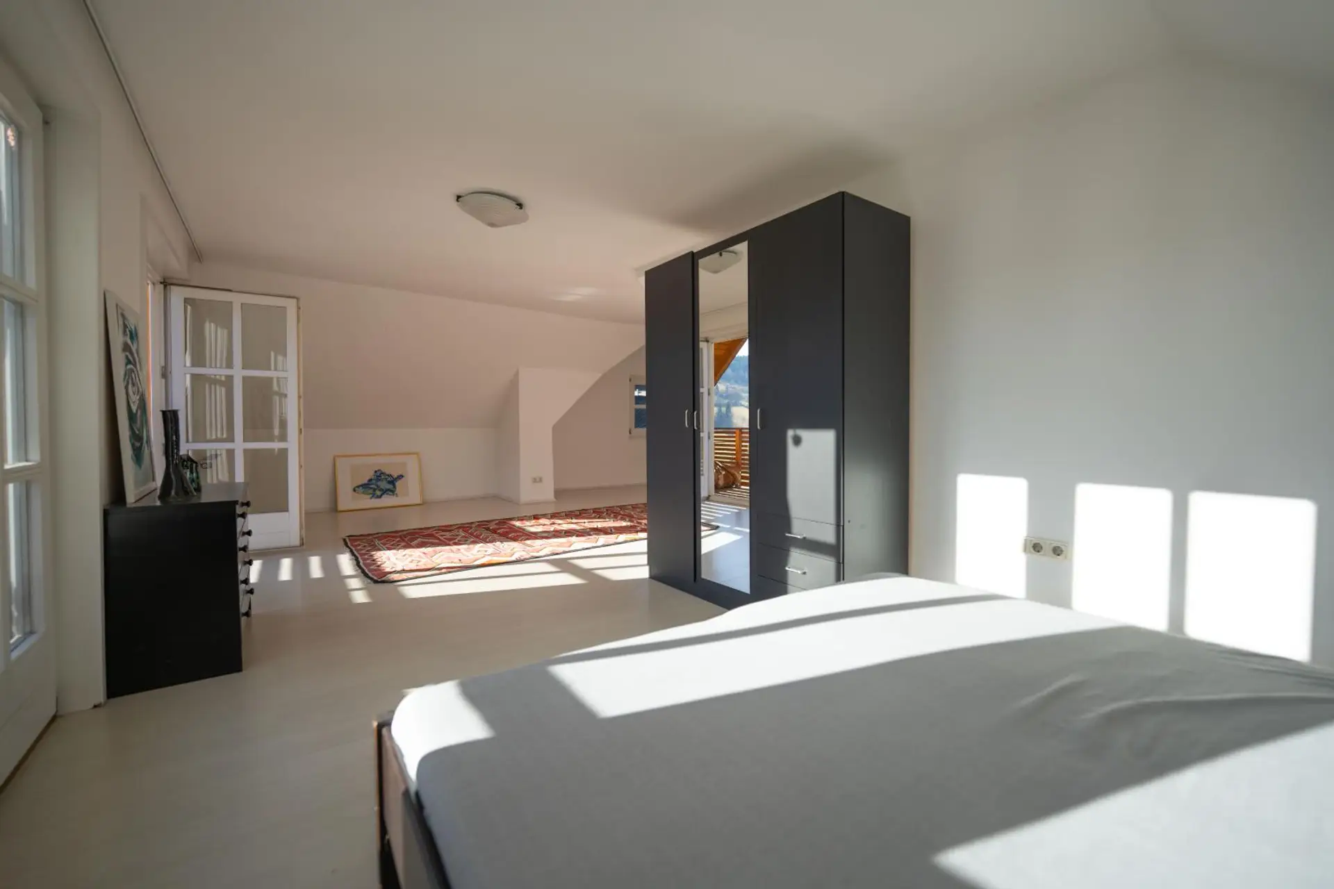 Besonders hervorzuheben ist der weitläufige Wohnbereich im Obergeschoss, von dem aus man den Balkon erreicht und einen schönen Ausblick ins Grüne genießt.