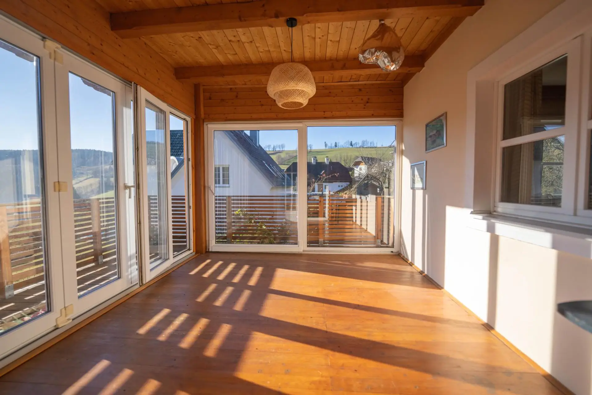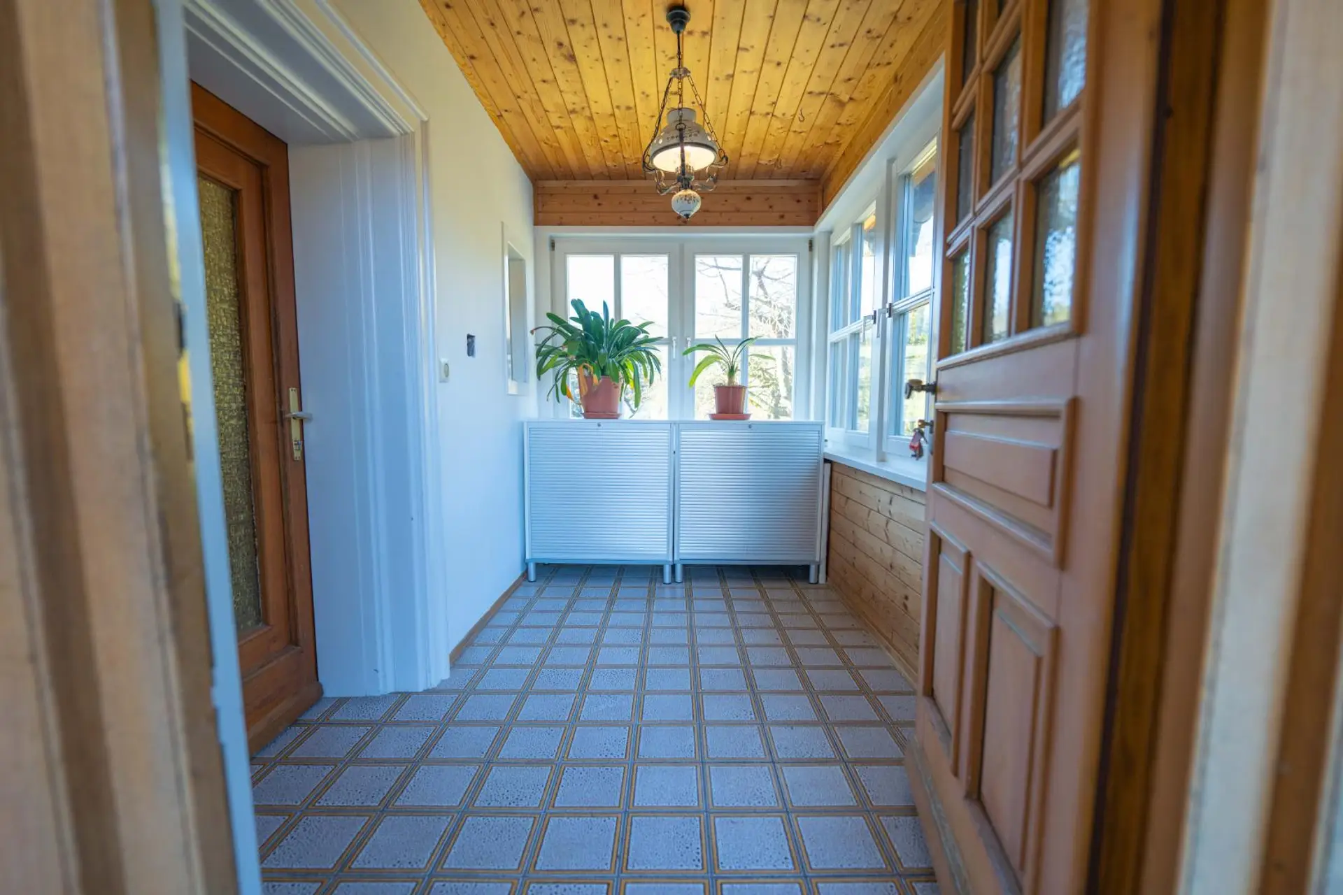 Vom gemütlichen Wohnbereich gelangt man in den großzügigen Wintergarten – ein lichtdurchfluteter Aufenthaltsbereich zum Entspannen und Genießen. Von hier aus führt ein Zugang auf den Balkon, der zusätzlichen Freiraum im Außenbereich bietet.