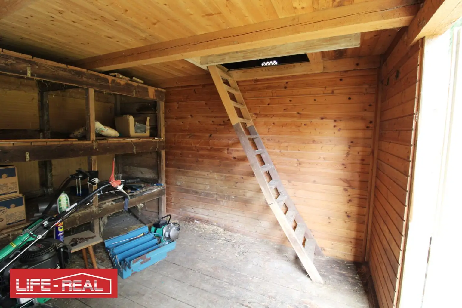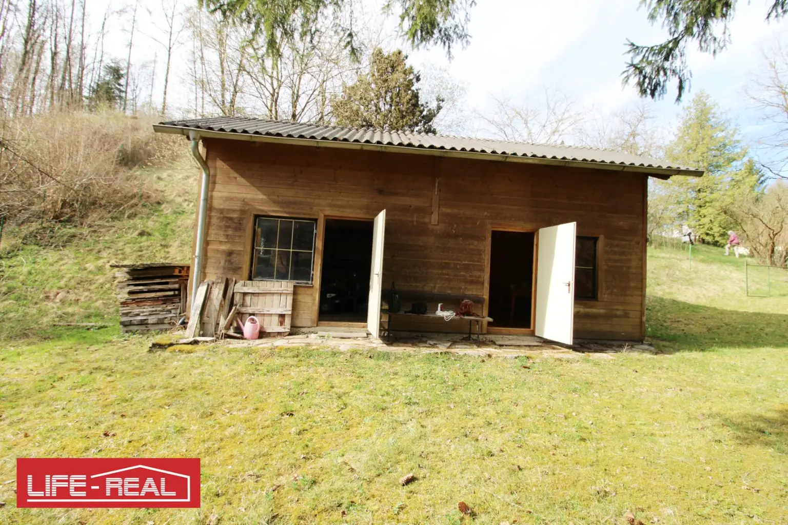 Auf dem Grundstück befinden sich zwei charmante Holzhütten, die vielseitig genutzt werden können, beispielsweise als Geräteschuppen, Rückzugsort oder einfache Aufenthaltsräume. Sie fügen sich harmonisch in das natürliche Gesamtbild ein und unterstreichen den rustikalen Charakter des Areals.