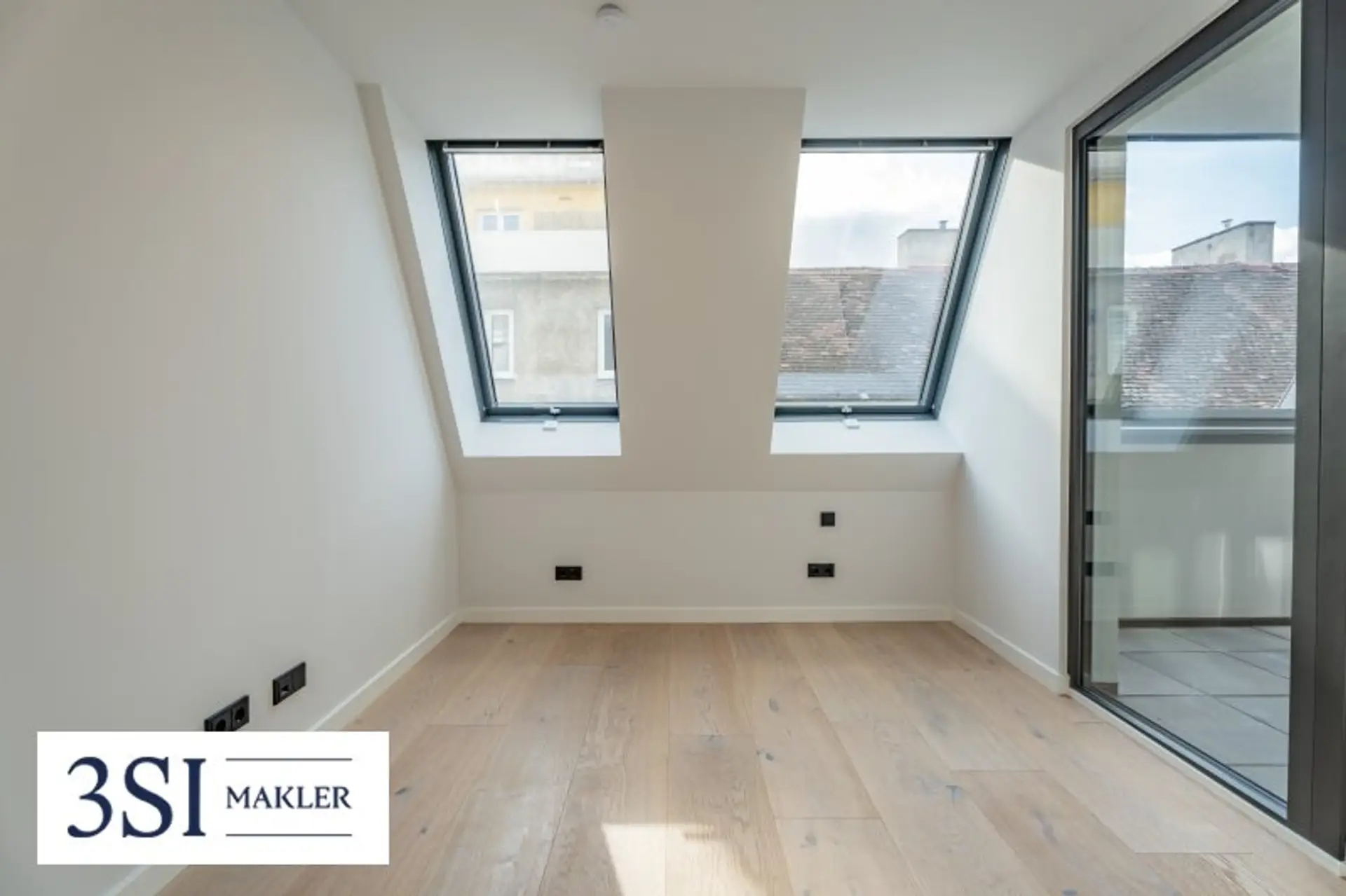 Die Dachgeschosswohnungen – drei Einheiten im 1. Dachgeschoß und das Penthouse im 2. Dachgeschoß – bilden das architektonische Highlight des Projekts. Großzügige Fensterfronten lassen die lichtdurchfluteten Räume erstrahlen und eröffnen eindrucksvolle Ausblicke über die Stadt.