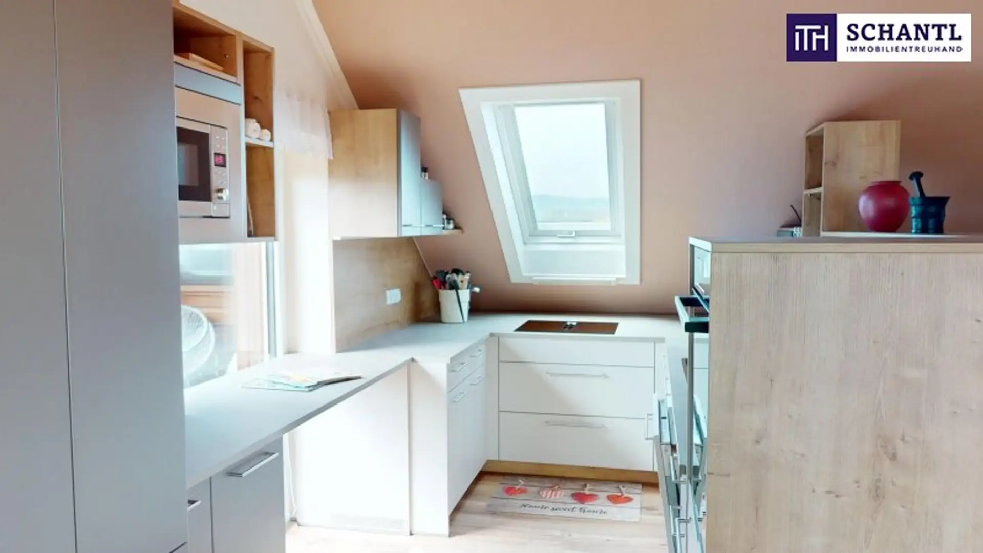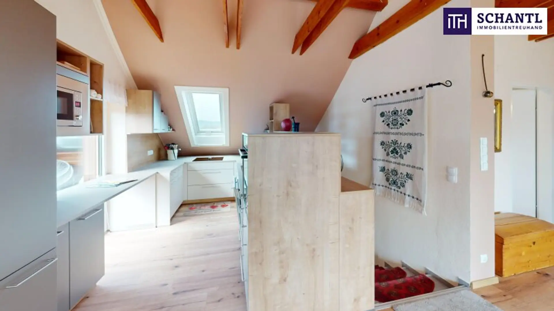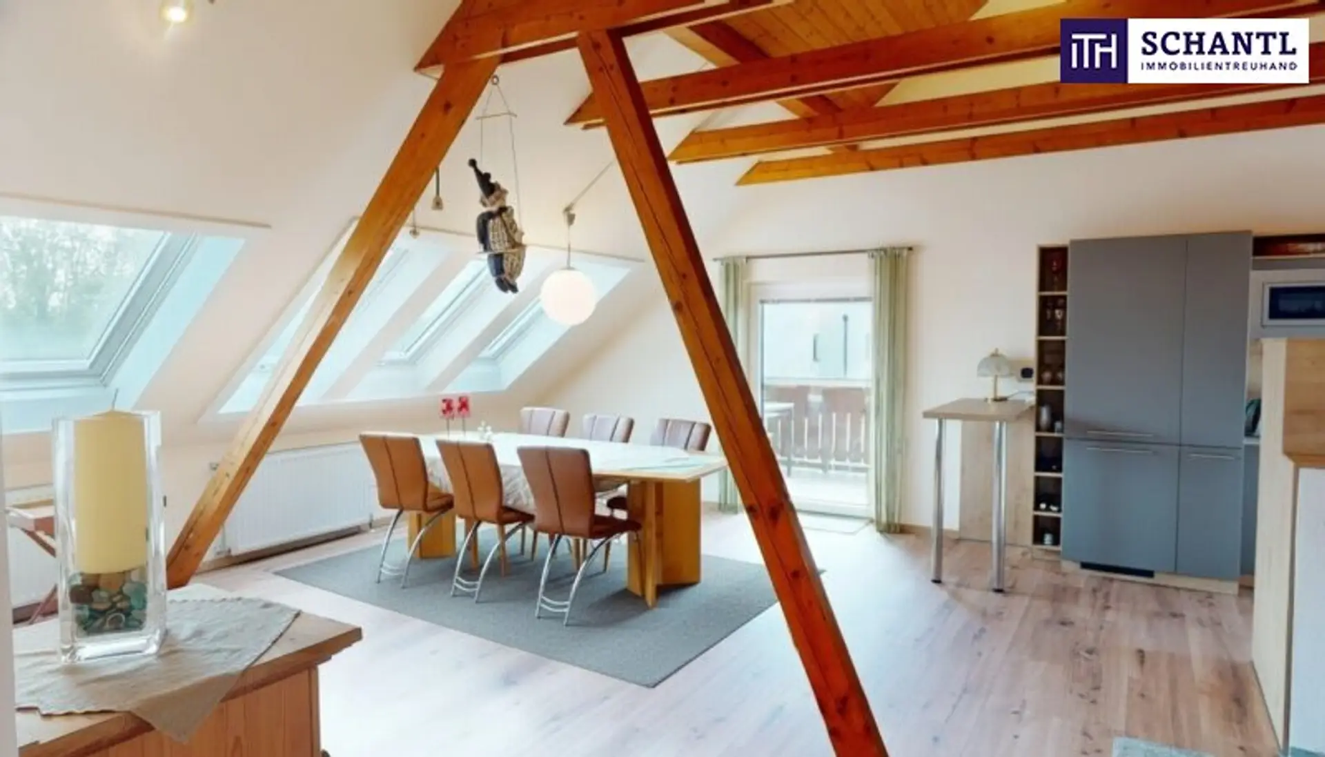 Ein echtes Highlight ist der Essplatz direkt unter dem großzügigen Dachfenster, das den gesamten Raum mit Tageslicht flutet und für eine einladende, freundliche Atmosphäre sorgt – ein Ort, an dem Wohnen, Genießen und Entspannen ineinander übergehen.
