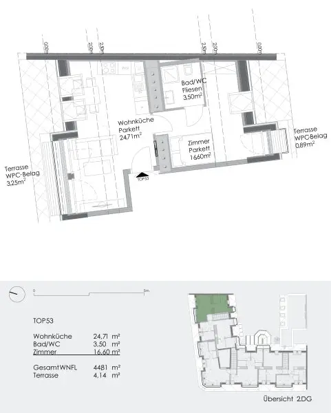 Die 2-Zimmer Wohnung mit 44,81 m² Wohnfläche und insg. 4,14 m² Terrassen liegt im 2. Dachgeschoss und gliedert sich in folgende Räume: