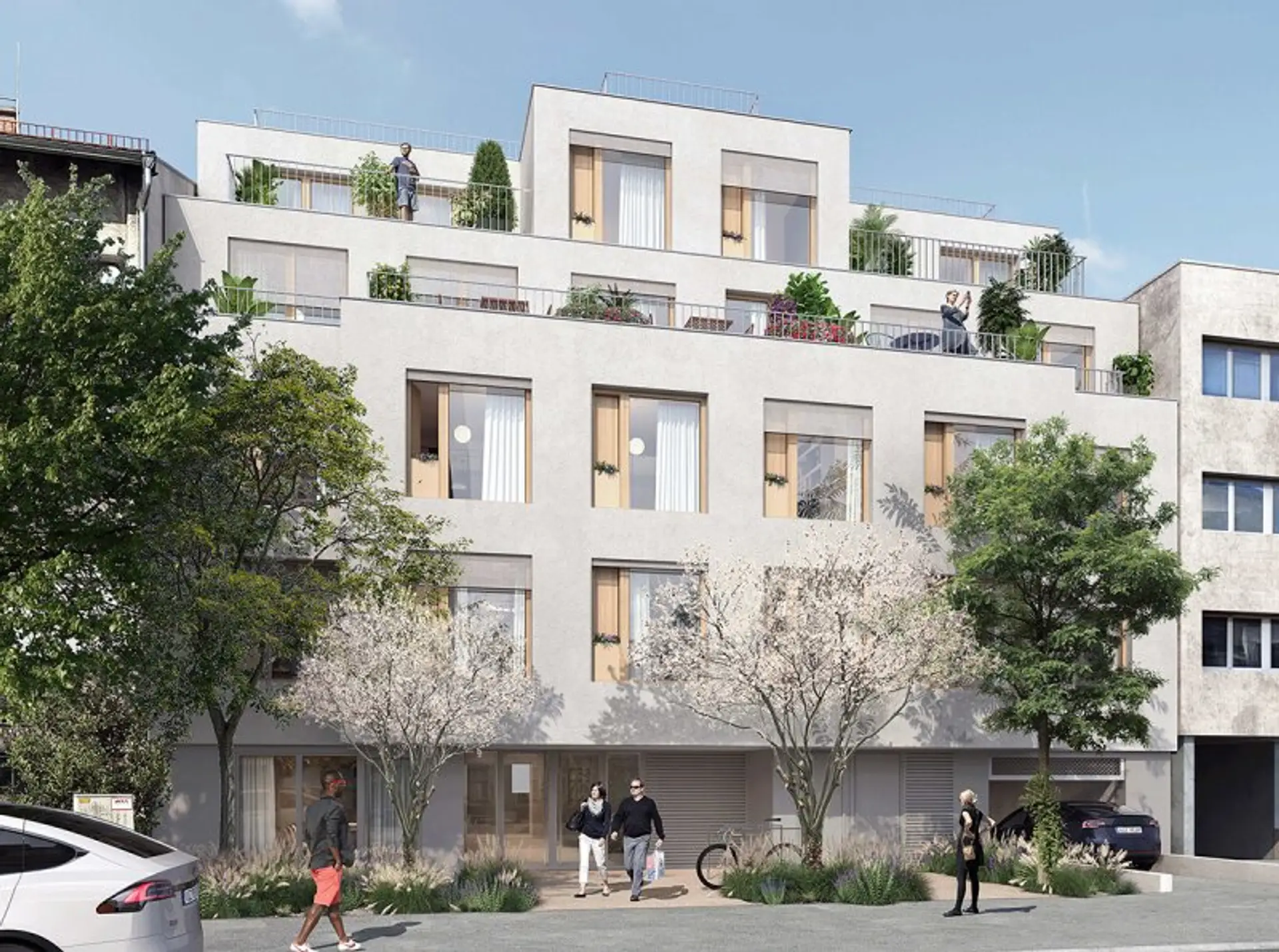 Über dem straßenseitigen Bauteil ist eine Dachterrasse mit Summer Kitchen und Außendusche geplant. Diese wird allen Bewohnern die Möglichkeit bieten, über den Dächern Wiens auszuspannen und den Weitblick zu genießen. Darüber hinaus verfügen ausgewählte Wohnungen über westseitig ausgerichtete, zugeordnete Dachterrassenabteile zur exklusiven Nutzung.