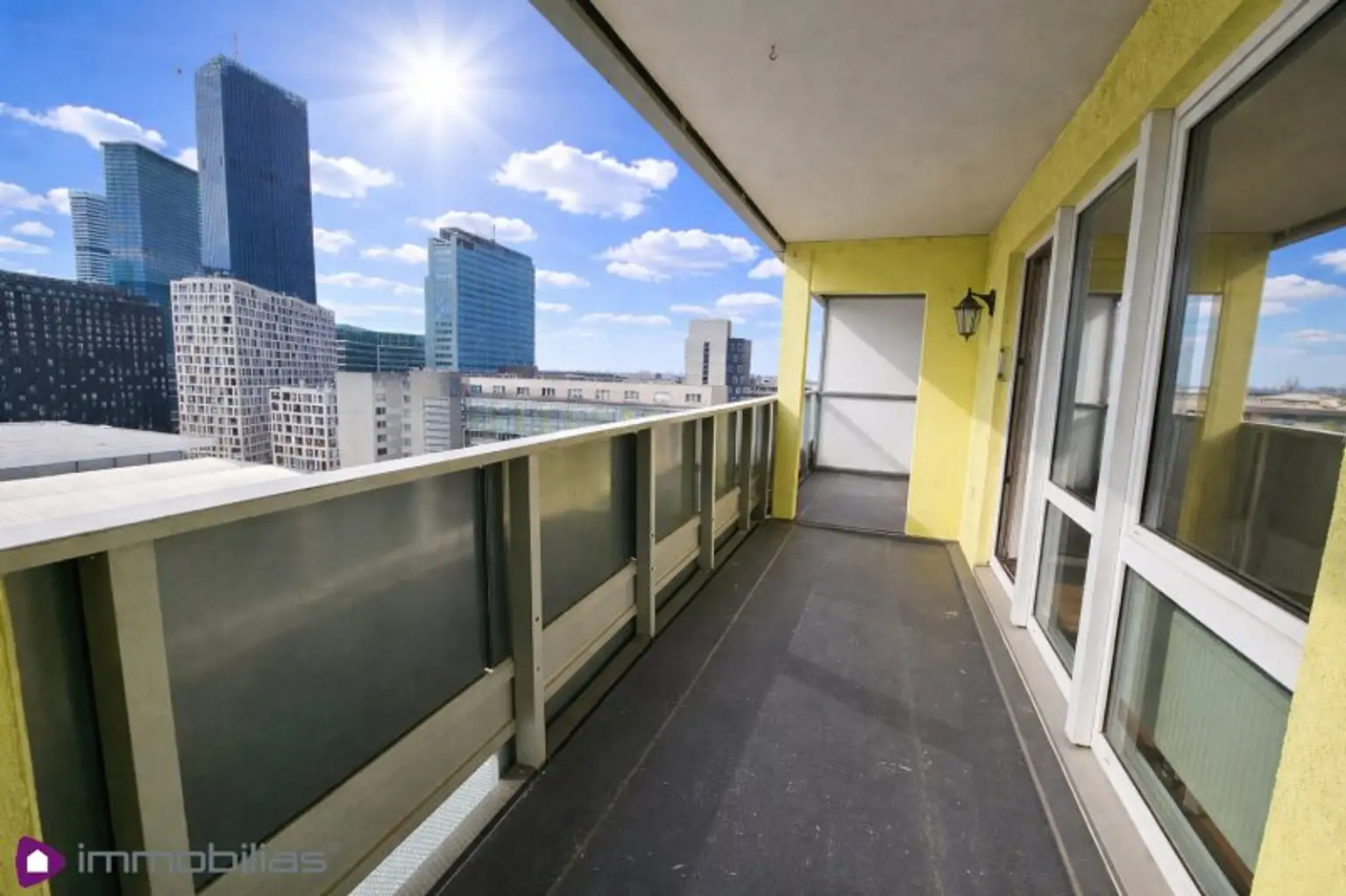Wohnküche mit kleiner Einbauküche (baulich abgetrennt, Küchennische), mit Ausgang auf die Loggia, Ausrichtung Südost/ Blick zur UNO City