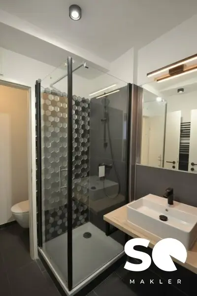 Bad (mit Dusche, Waschbecken und Handtuchheizkörper)