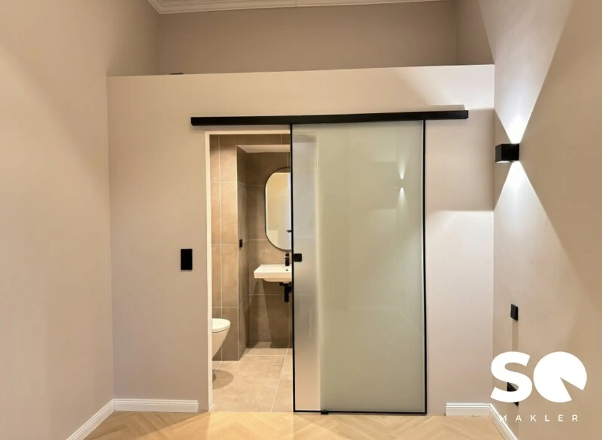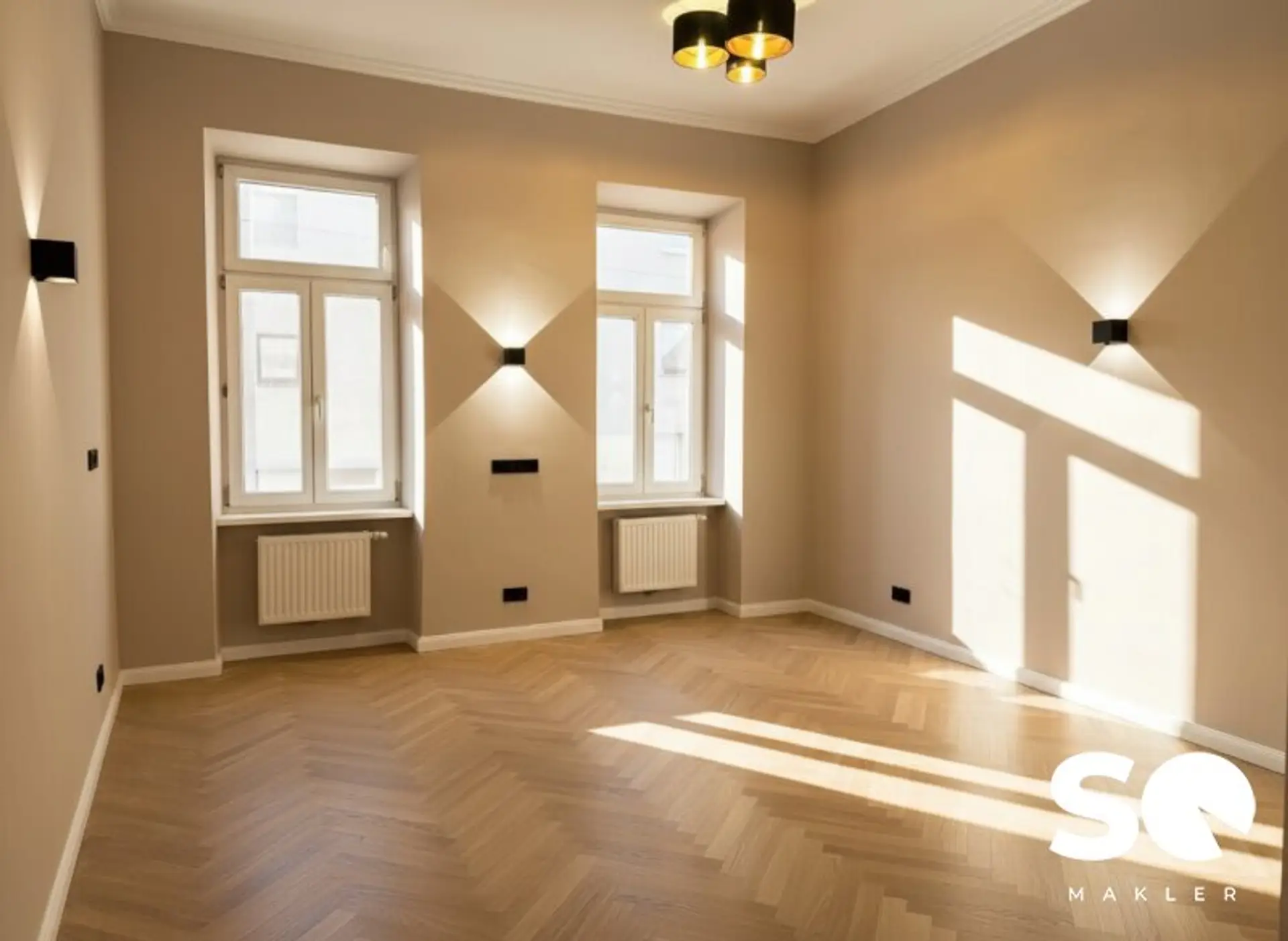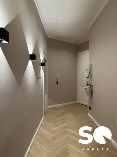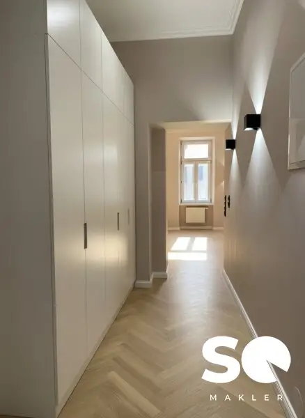 Die Wohnung wurde soeben generalsaniert und wird als hochwertiger Erstbezug angeboten. Historische Elemente wie Stuckatur treffen hier auf ein modernes Beleuchtungskonzept mit stilvollen Wandleuchten, edle Materialien und zeitloses Design.