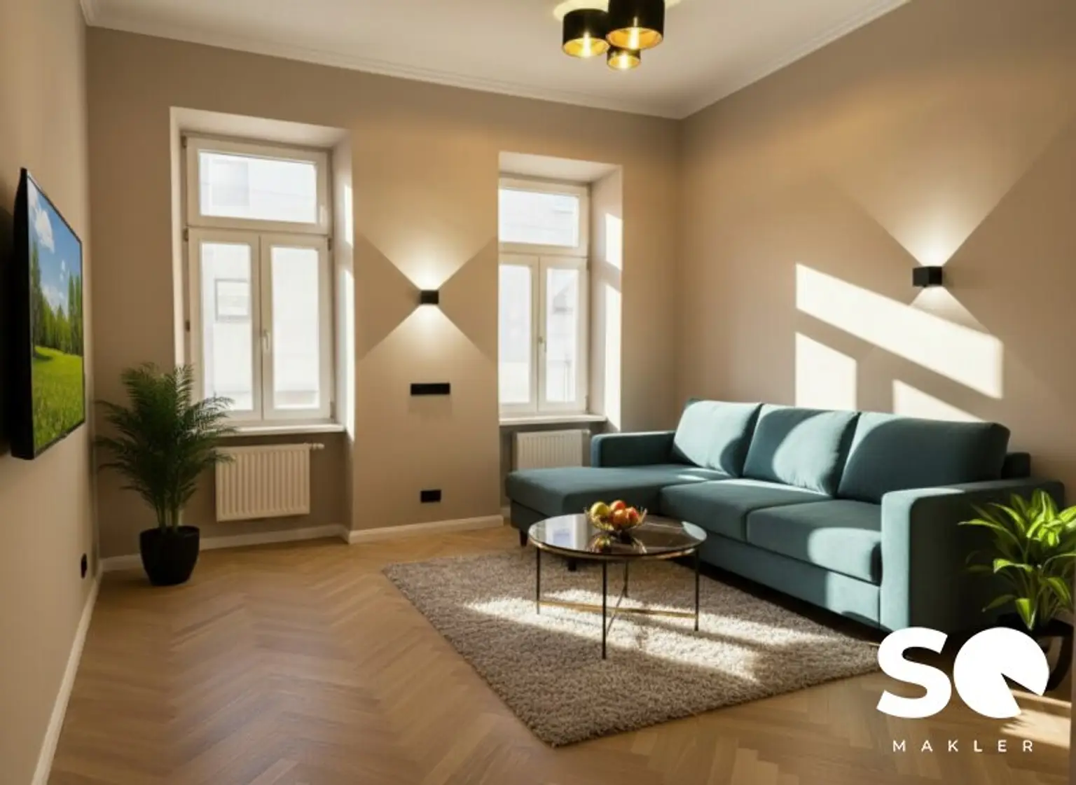 Die Wohnung wurde soeben generalsaniert und wird als hochwertiger Erstbezug angeboten. Historische Elemente wie Stuckatur treffen hier auf ein modernes Beleuchtungskonzept mit stilvollen Wandleuchten, edle Materialien und zeitloses Design.